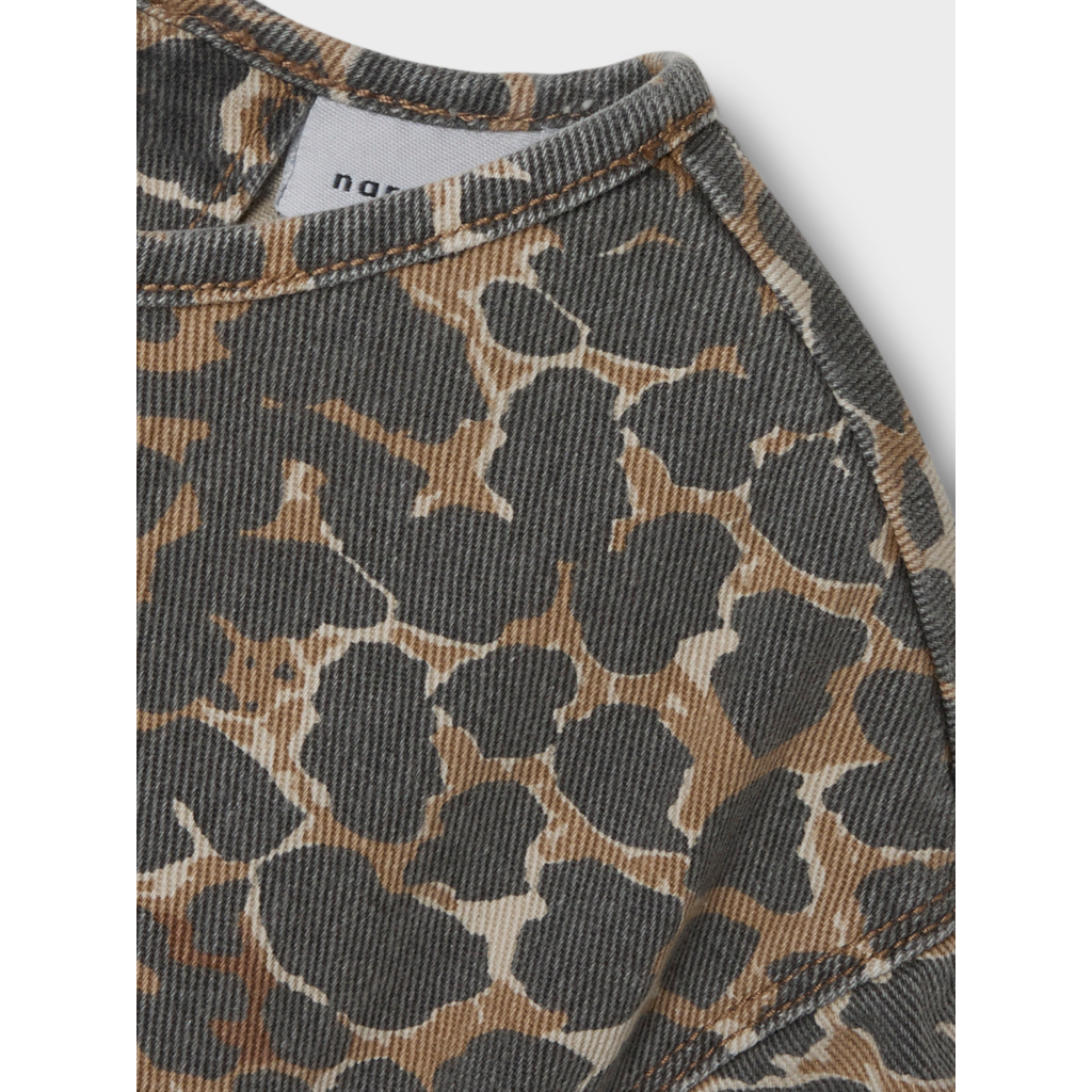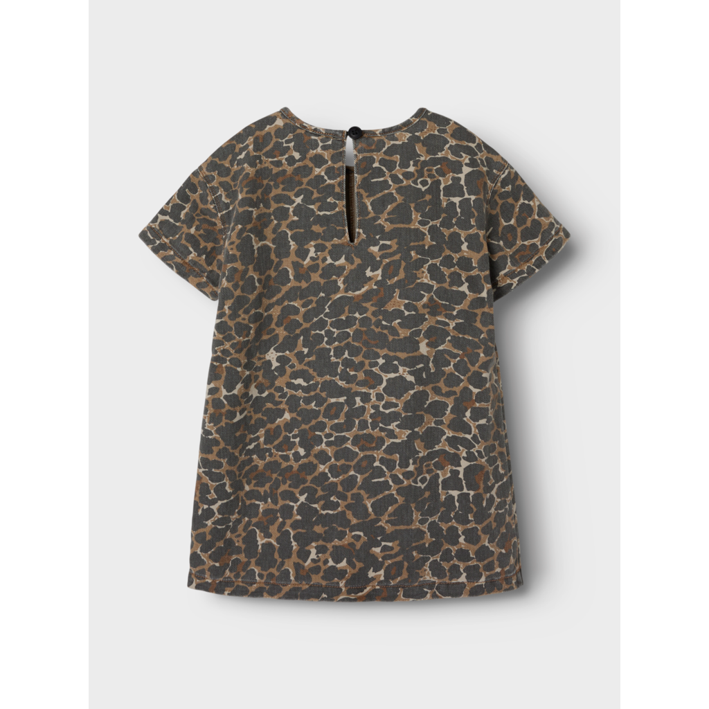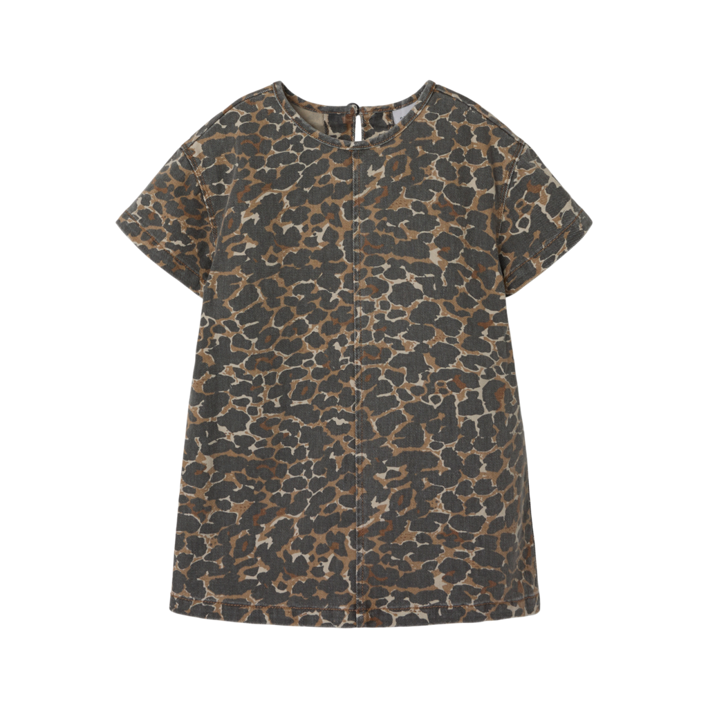 Sødeste søde denim kjole fra Name it. Den er med møg sejt leo print i forvaskede farver. Den er i lige fit, med korte ærmer og rund hals. Den er med hul knap lukning i nakken.