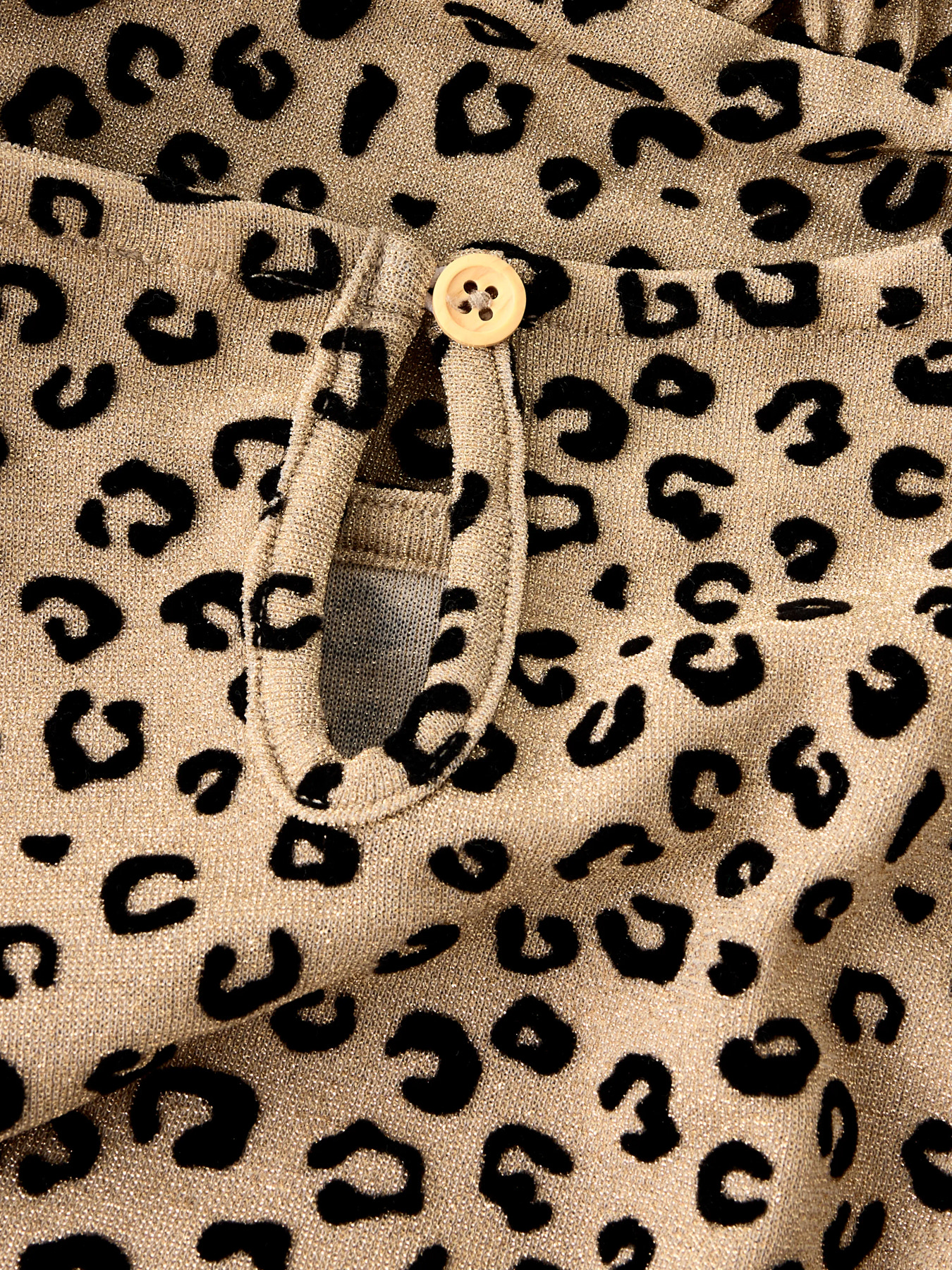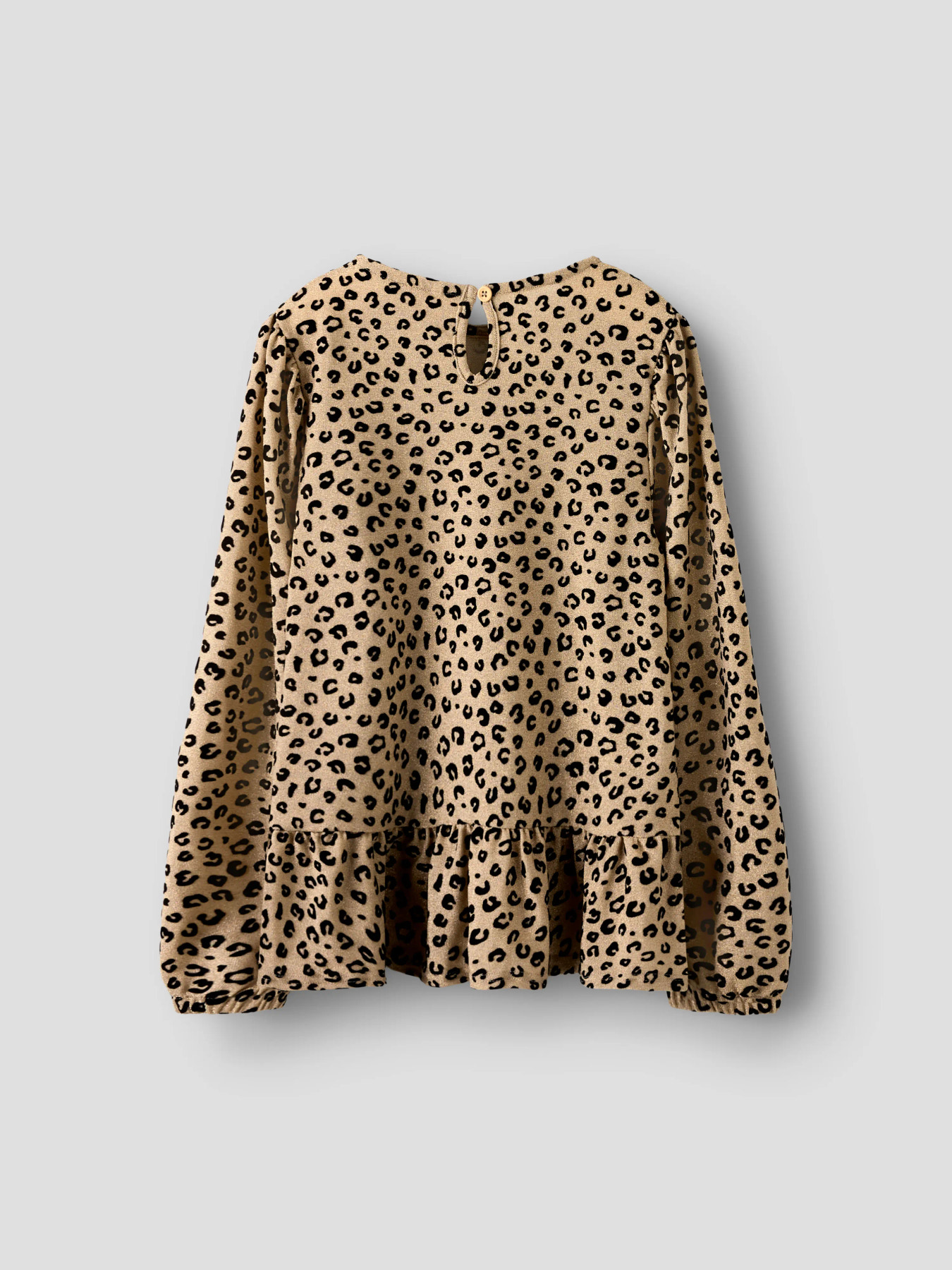Mega fin langærmet bluse fra Name it i leo mønster i fine farver og med glimmer tråd. Den er i super blød kvalitet og med peplum skørt detalje i bunden. Den lukkes med knap i nakken.
