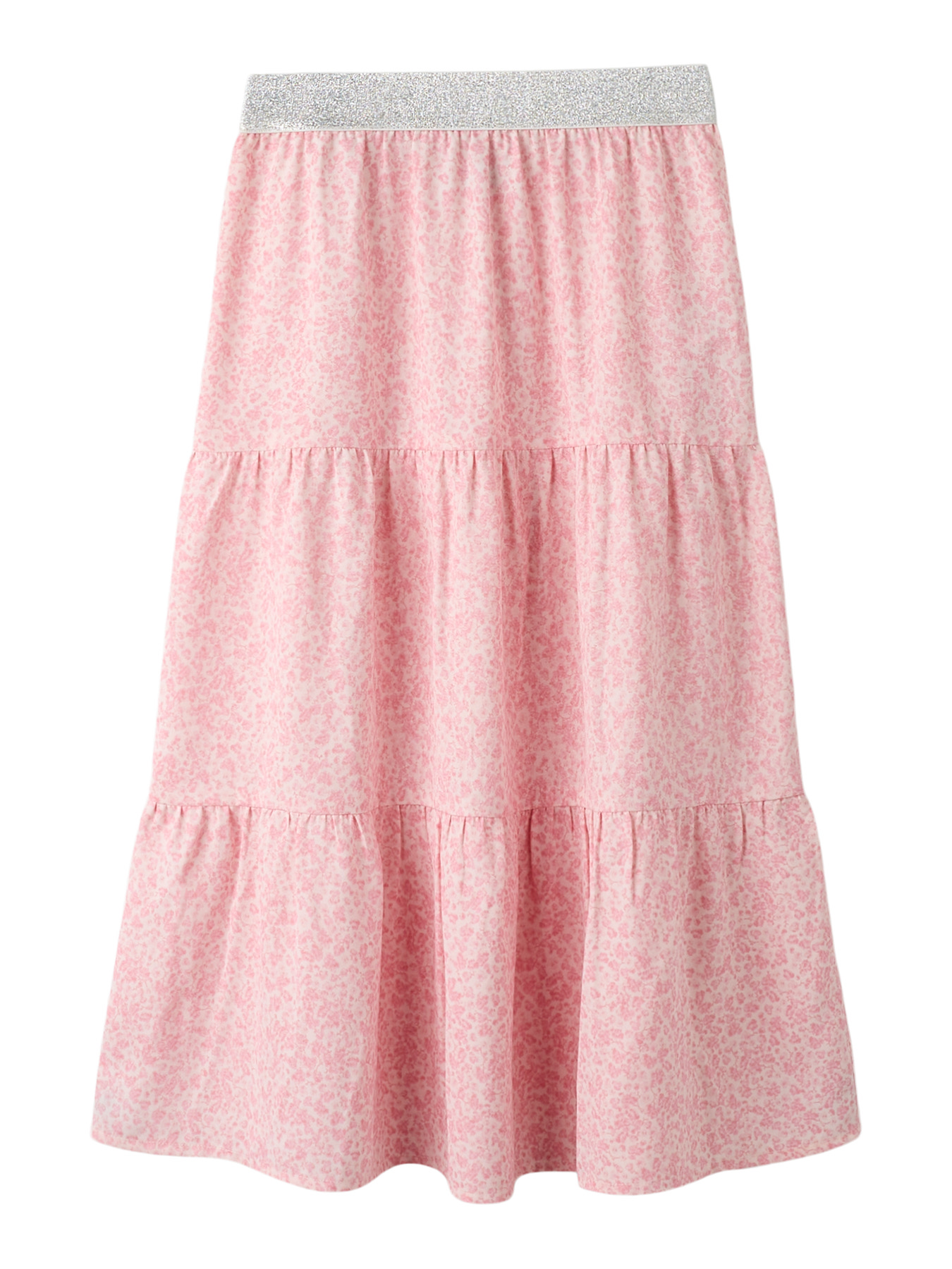 En smuk, lagdelt nederdel fra Name It med et yndigt blomsterprint og i en lækker, let kvalitet. Nederdelen er en lang model og har en bred glimmer elastik i taljen.