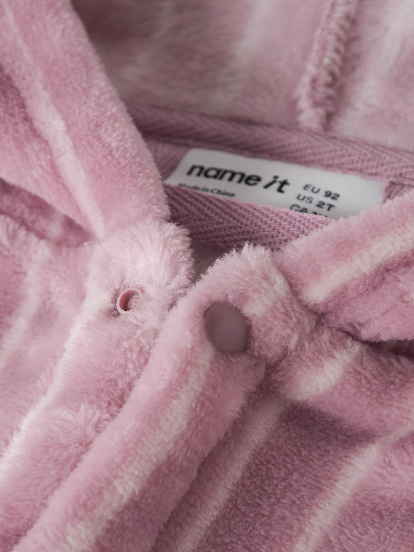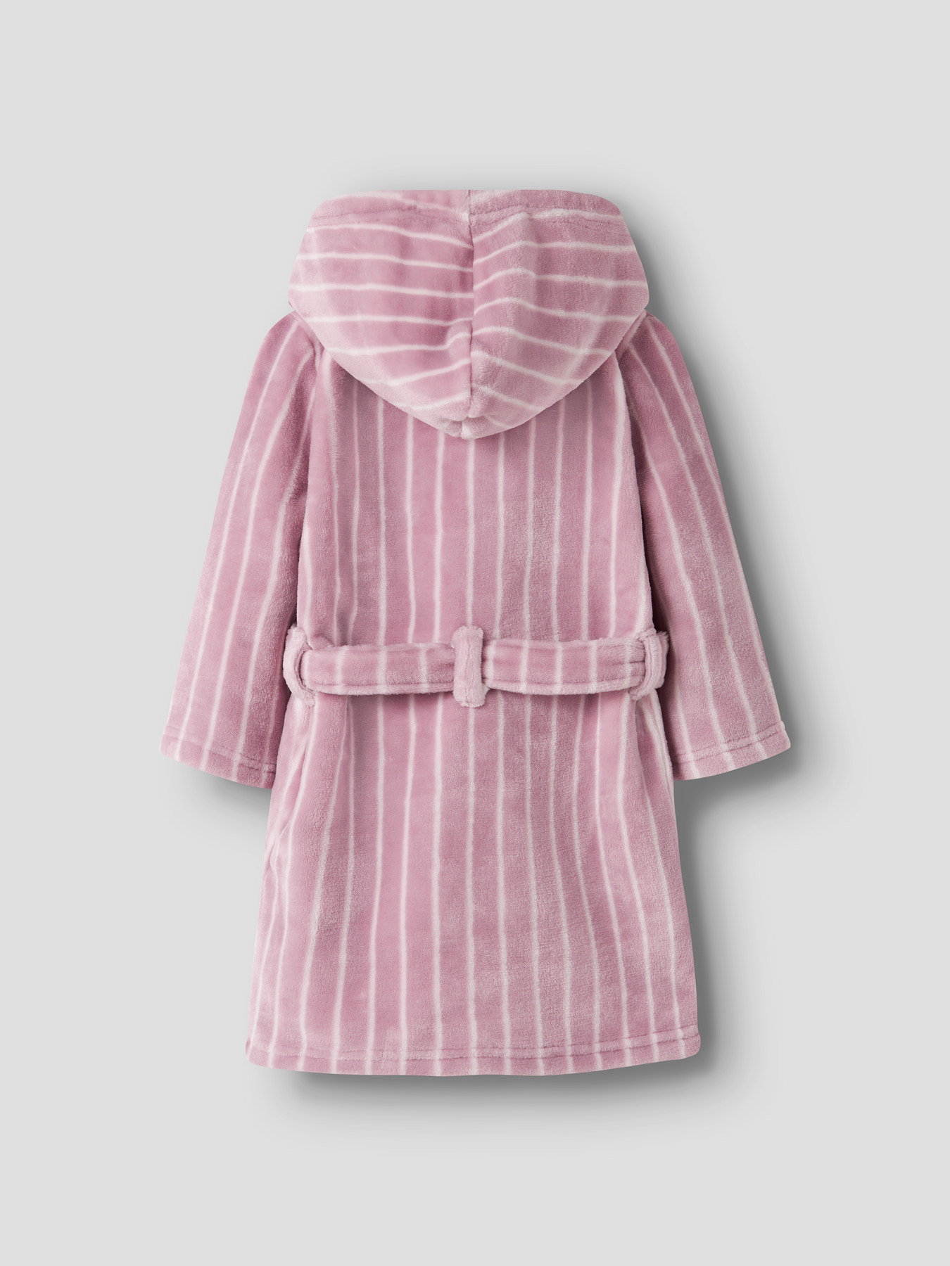 Mega lækker morgenkåbe fra Name it. Den er i flot rosa farve med tynde striber. Den er med hætte, bindebånd i livet og trykknap øverst. Den er i mega blød kvalitet og med lommer på siderne.