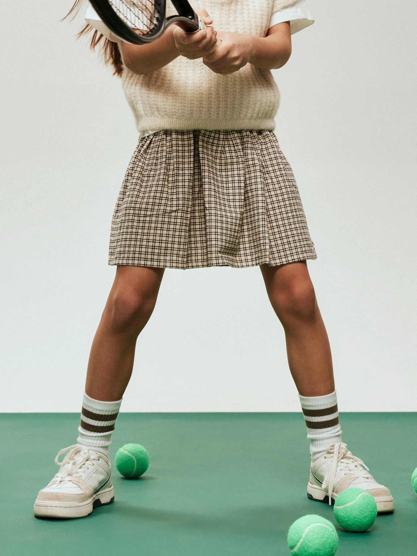 Den sejeste nederdel fra Name it med smukke tern. Nederdelen har elastikkant i taljen, hvor der også er mulighed for at justere størrelsen indvendigt.