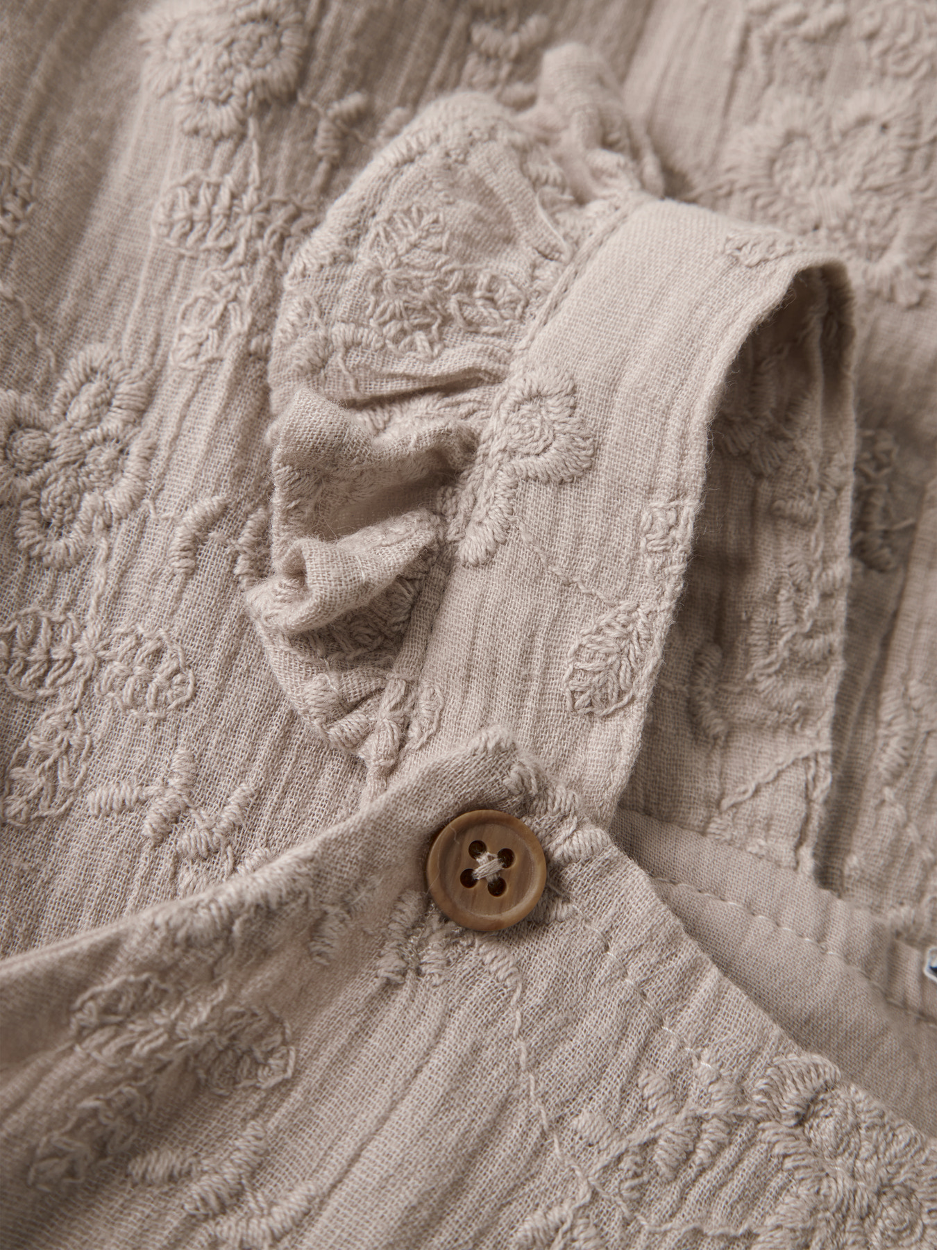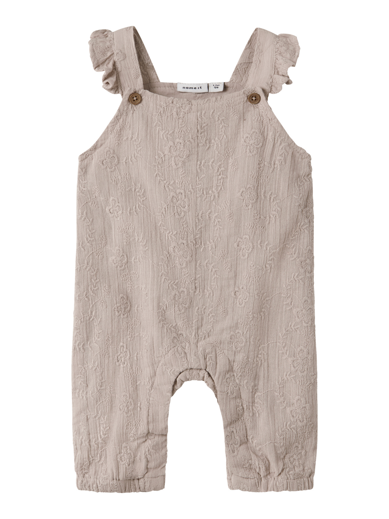De sødeste små overalls fra Name It med et yndigt, broderet mønster på og med flæser på selerne. Der er trykknapper rundt langs benene og selerne lukkes foran med søde knapper.