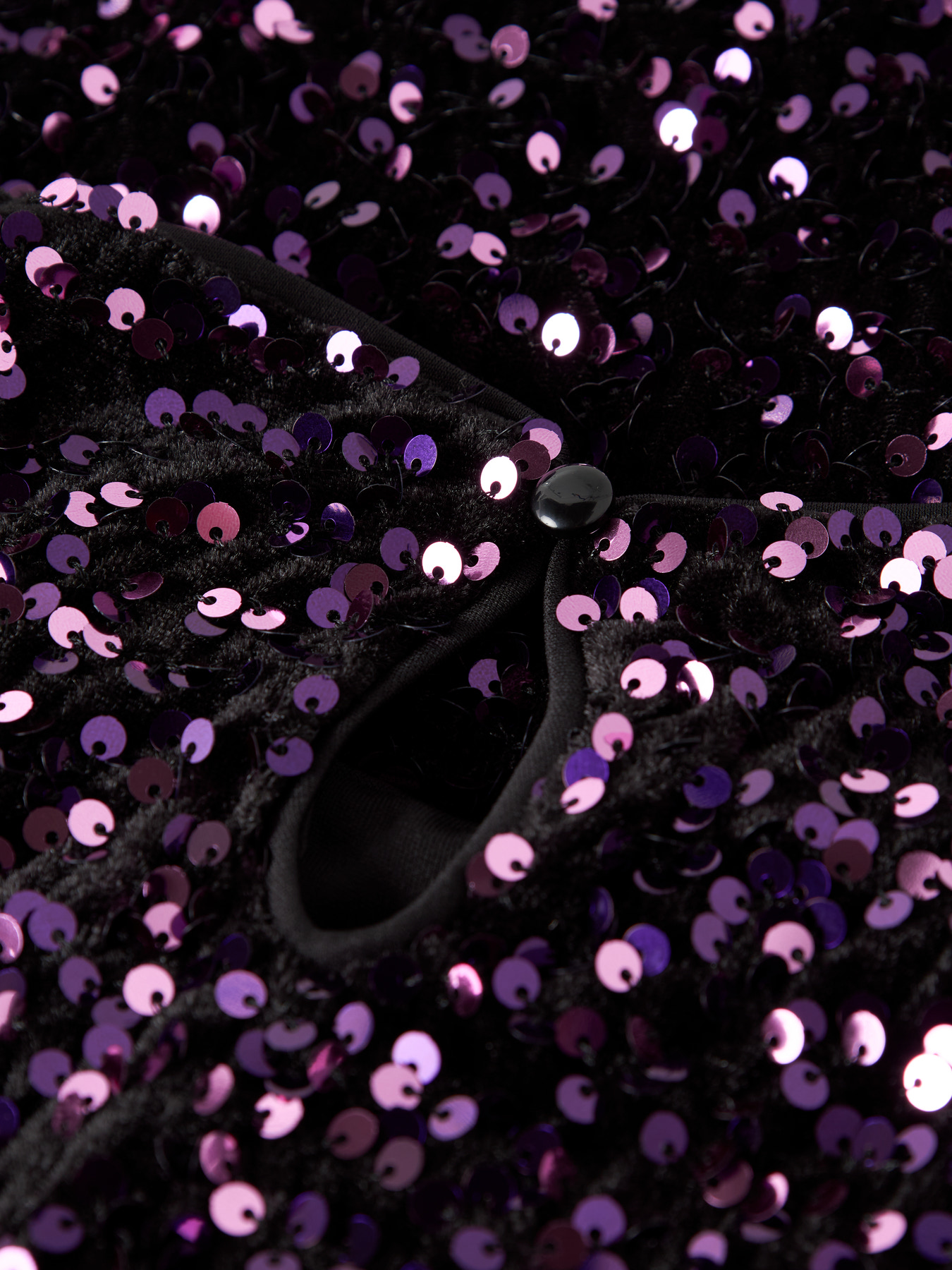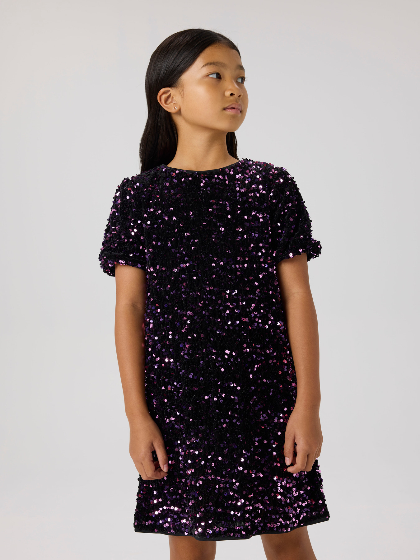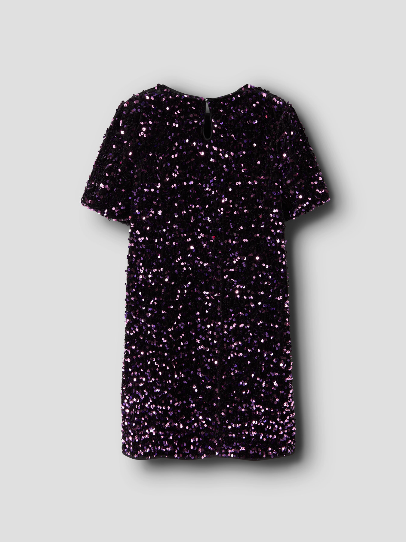 Smukkeste paillet kjole fra Name it. Kjolen er med korte ærmer og beklædt med skinnende pailletter over det hele.