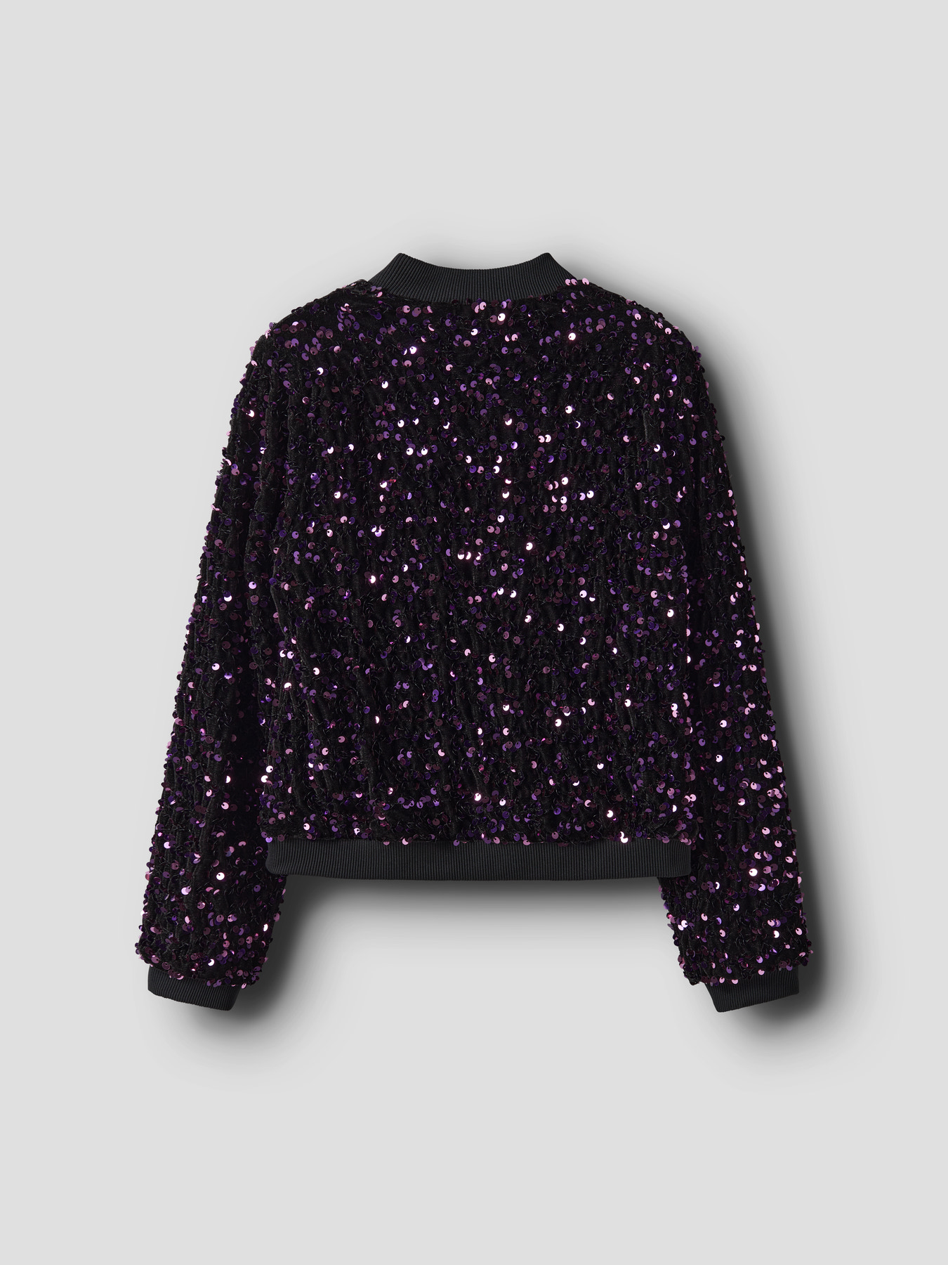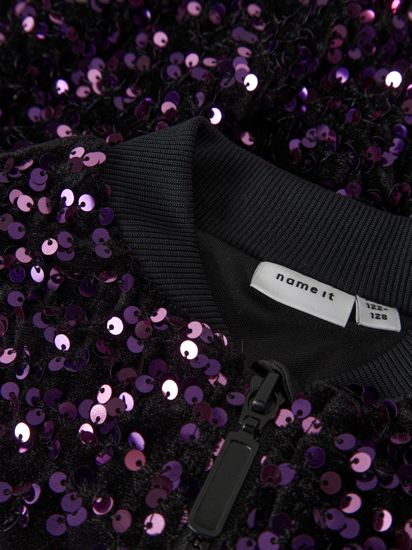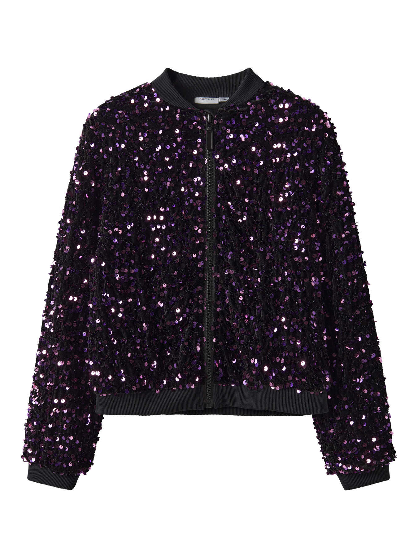 Smukkeste bomberjakke fra name it besat med pailletter i skinnende farver. Jakken er med lynlås hele vejen ned samt elastikkant ved hænder og mave.