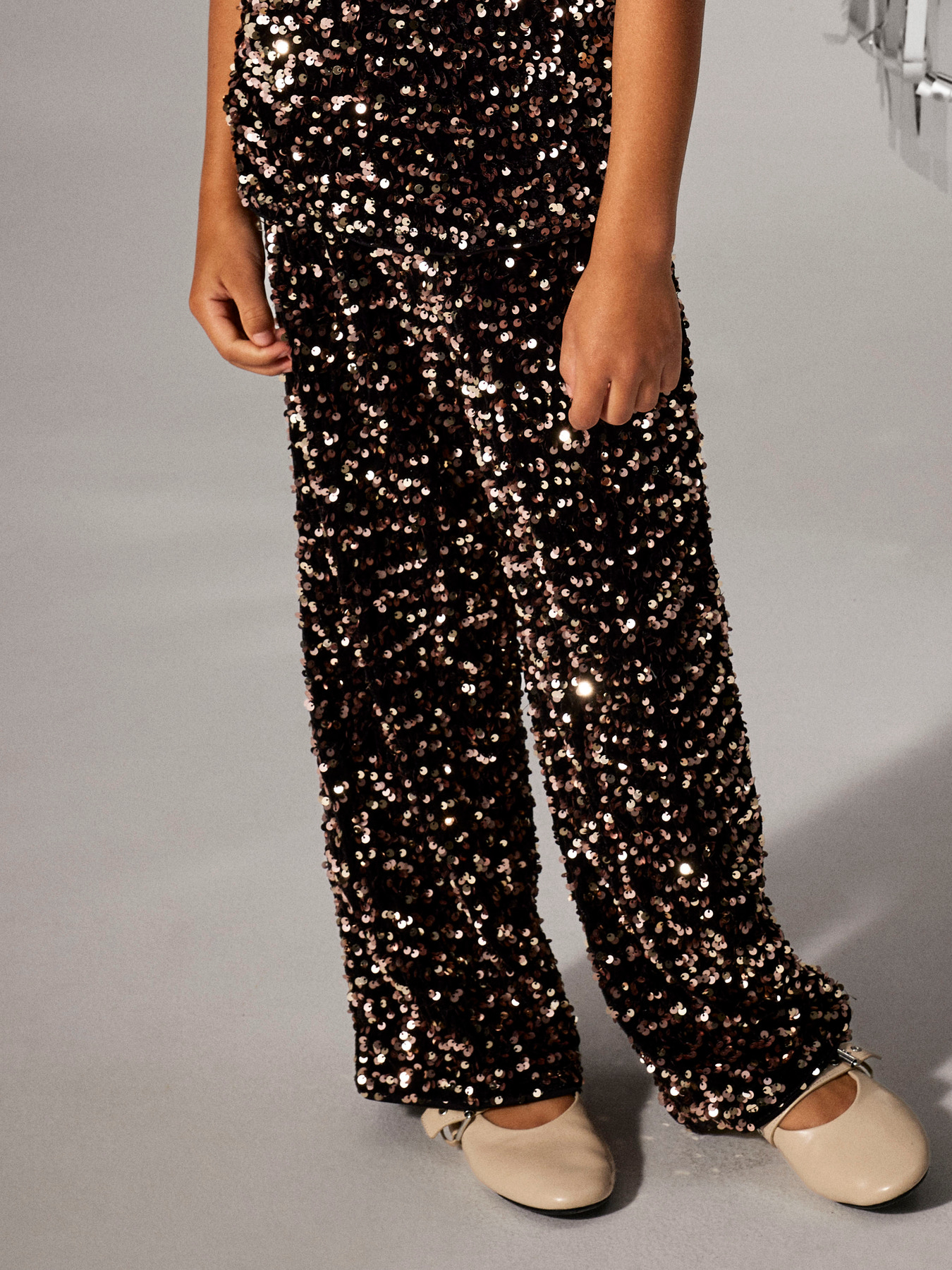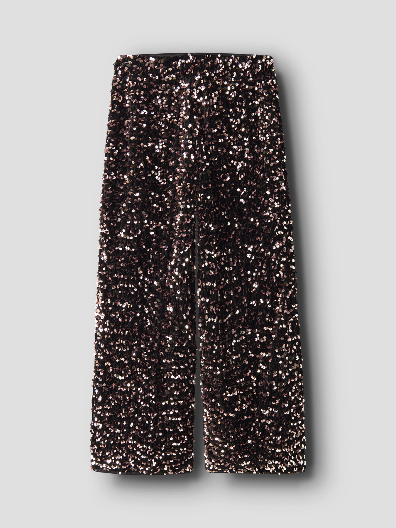 Smukkeste glimmer bukser fra name it. Bukserne er med brede ben og elastik i livet samt størrelsen kan justeres indvendig. De er pyntet med pailletter der skinner og glimter så fint.