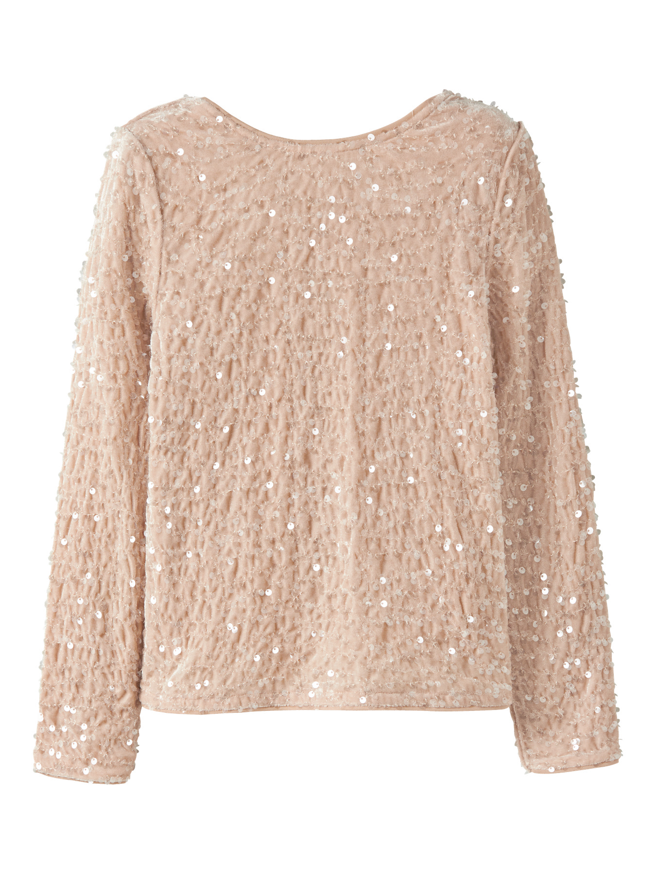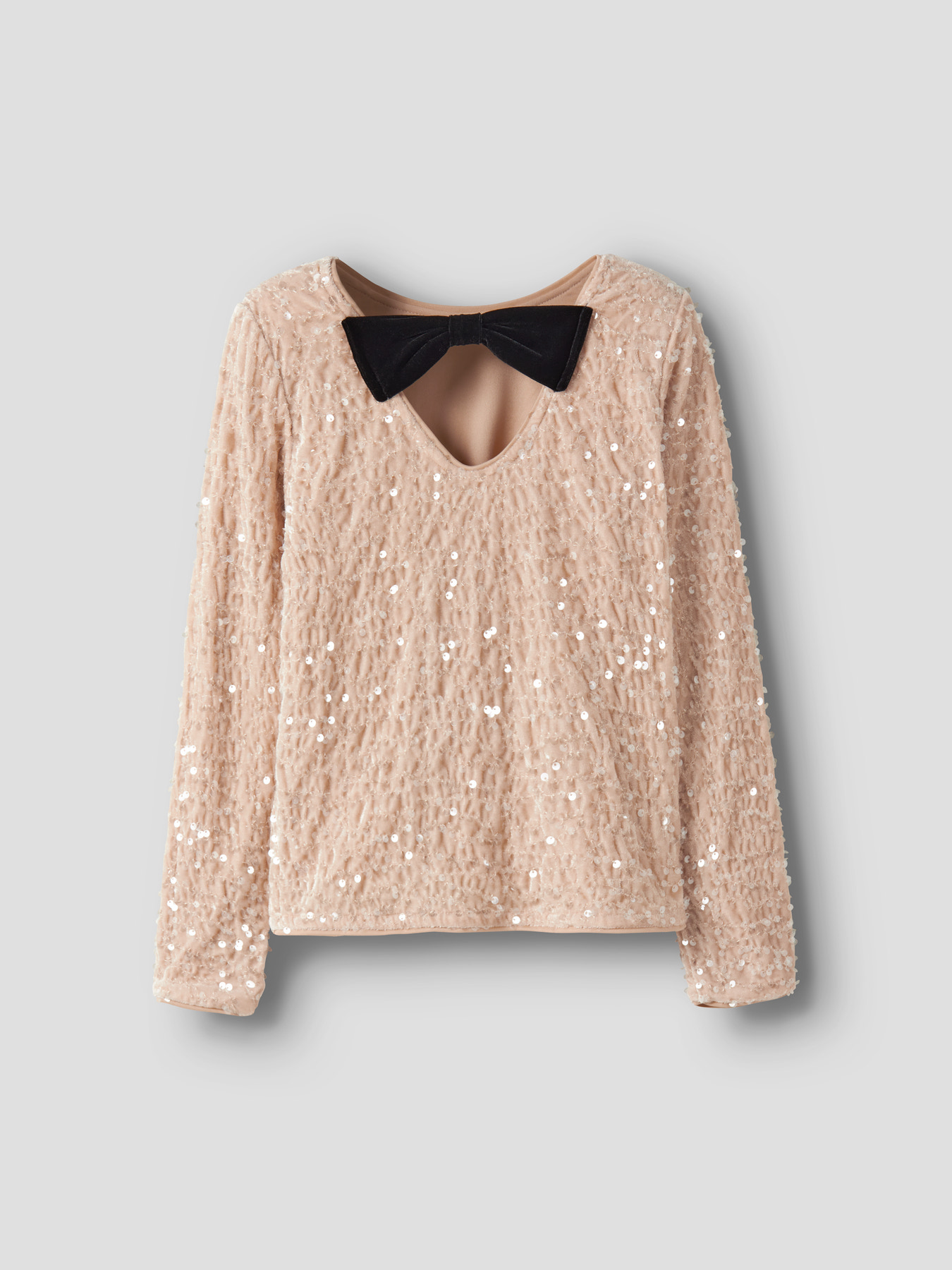 Smukkeste glimmer paillet bluse fra Name it. Blusen er i en smuk farve med den fineste store sløjfe bagpå.
