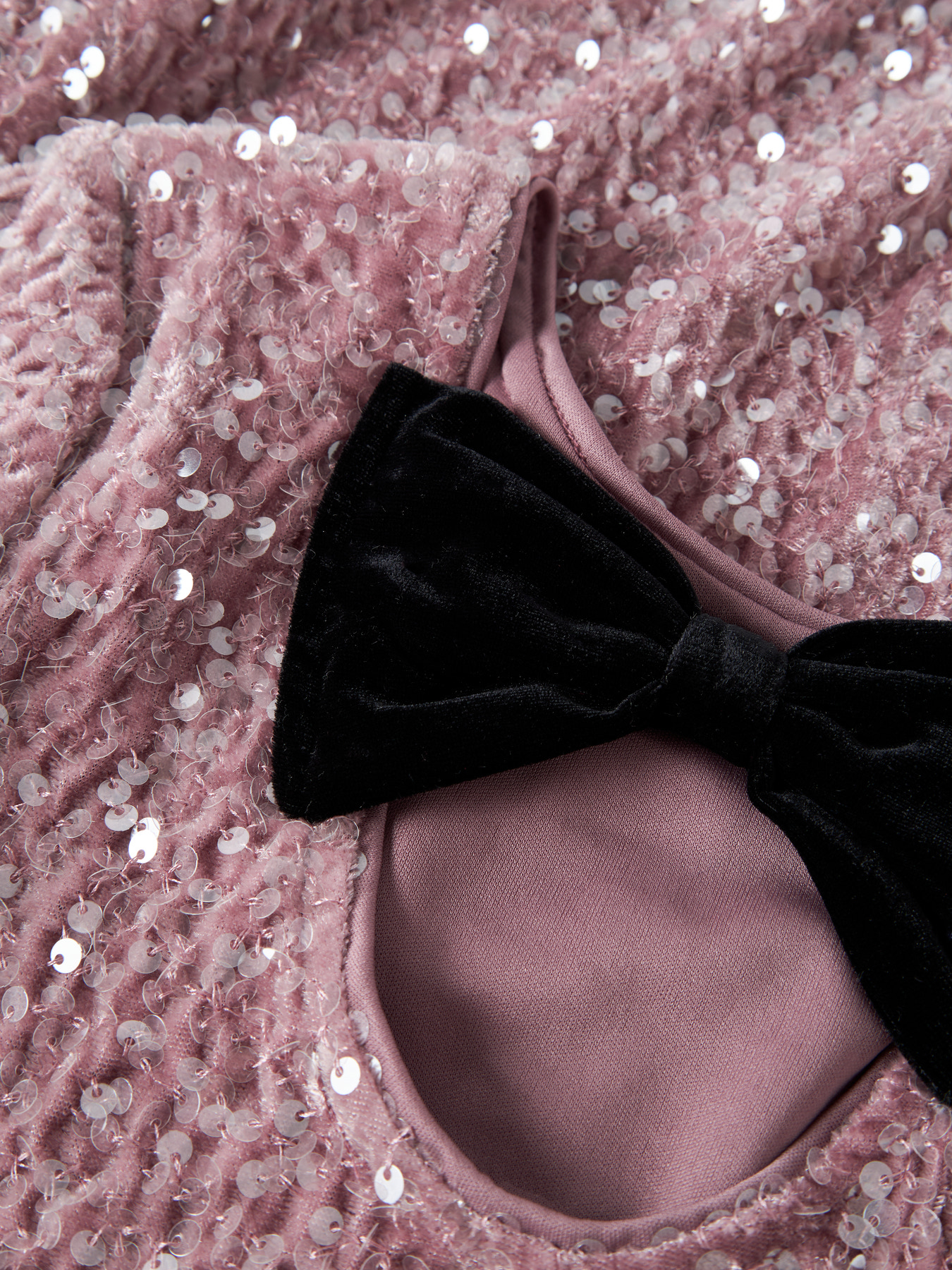 Smukkeste smukke kjole fra Name it. Den er med lange ærmer som er lidt bredere ved hænderne. Den er med pailletter over det hele og den fineste detalje med udskæring og stor sløjfe i nakken.
