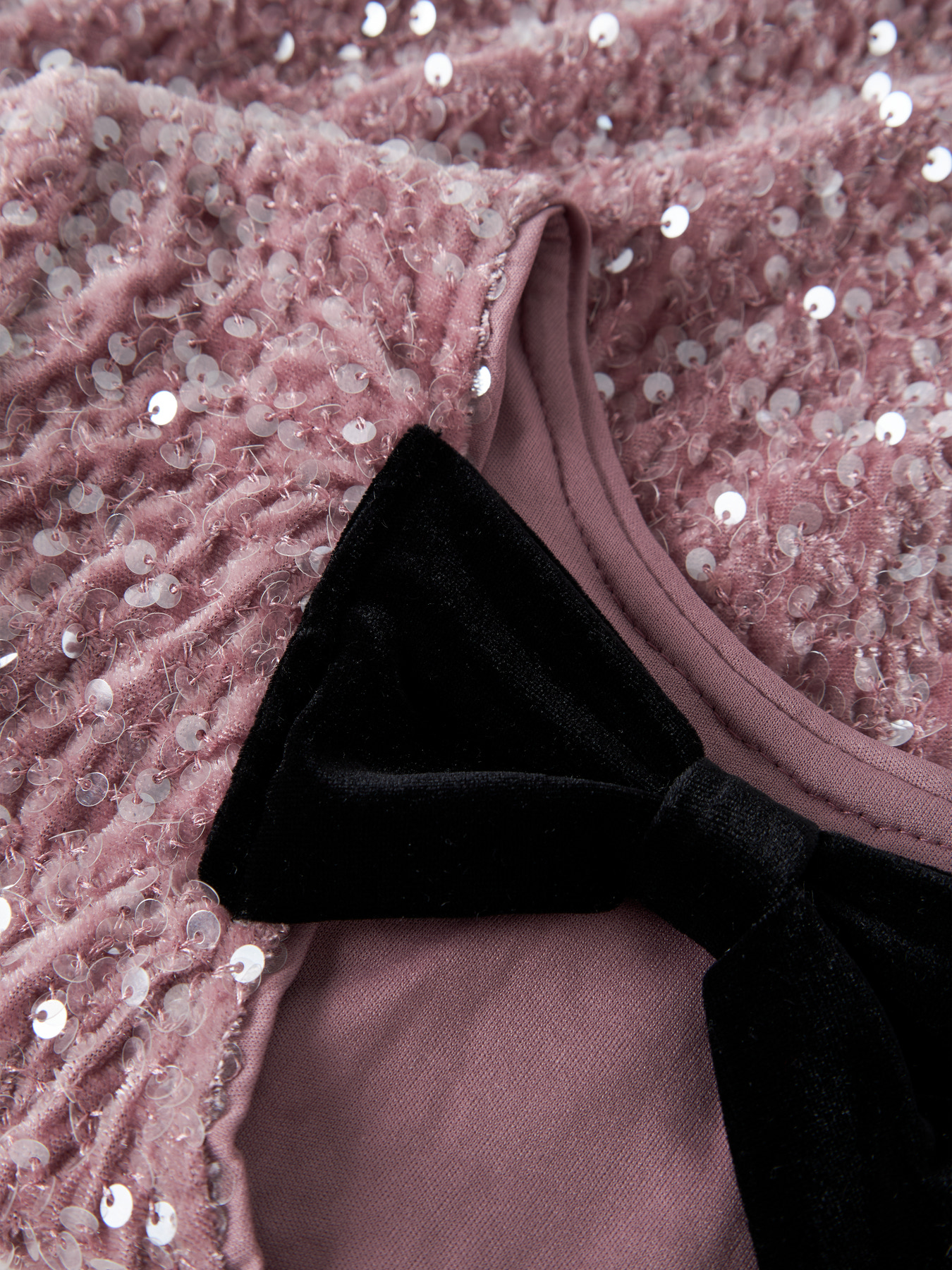 Smukkeste glimmer paillet bluse fra Name it. Blusen er i en smuk farve med den fineste store sløjfe bagpå.