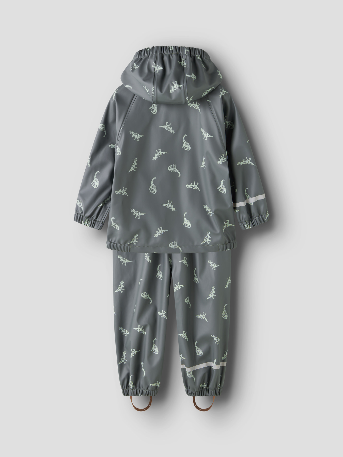 Sættet har aftagelig hætte af hensyn til sikkerheden, elastiske manchetter og justerbare seler for optimal pasform. Bukserne har elastiske benkanter samt aftagelige og justerbare elastikstropper under fødderne, så de bliver siddende, hvor de skal. Lynlåsen har en blød beskytter, der skåner huden, og dekorative refleksdetaljer øger synligheden. Det gennemgående print giver et farverigt og legende udtryk.
