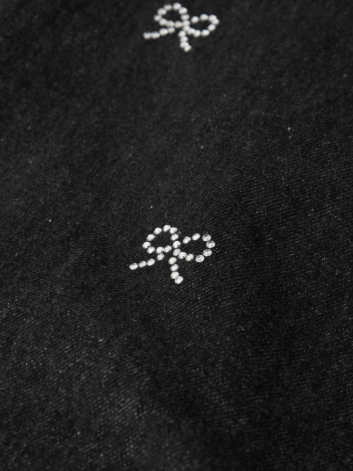 Smukkeste jeans fra Name it. De er i mørk vask og med de fineste sløjfer lavet i rhinsten ned langs benene. De er med brede ben og mulighed for at justere størrelsen indvendig i livet.