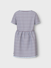 Lækker og blød kjole fra Name it med fine striber. Kjolen har korte t-shirt ærmer og rund halsåbning. I ærmegab og nederst på kjolen er der en sød bøljekant.