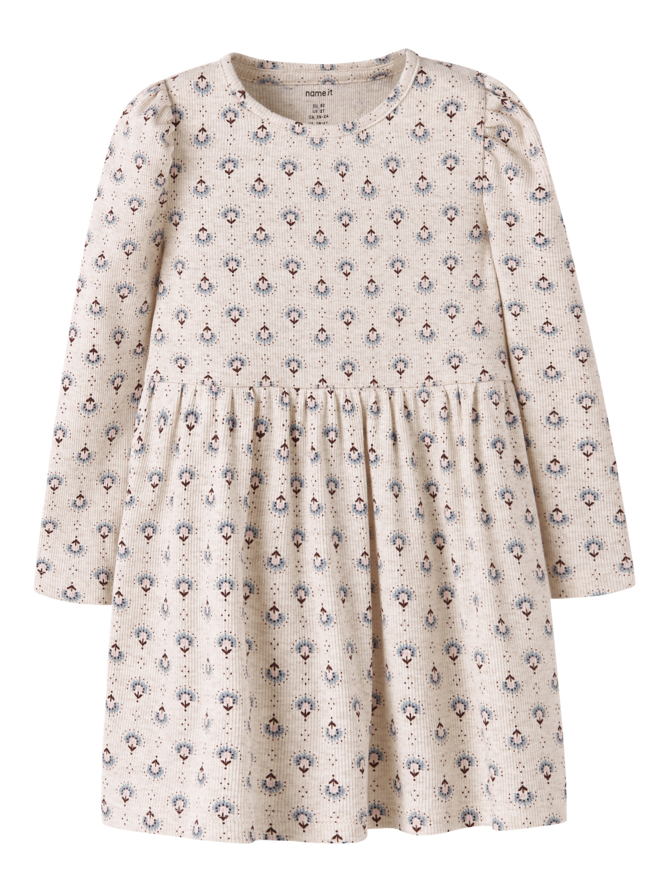 Smukkeste kjole fra Name it med lange ærmer. Kjolen er i blød og lækker rib kvalitet. Den er med mønster i de fineste farver og sødt snit ved maven.