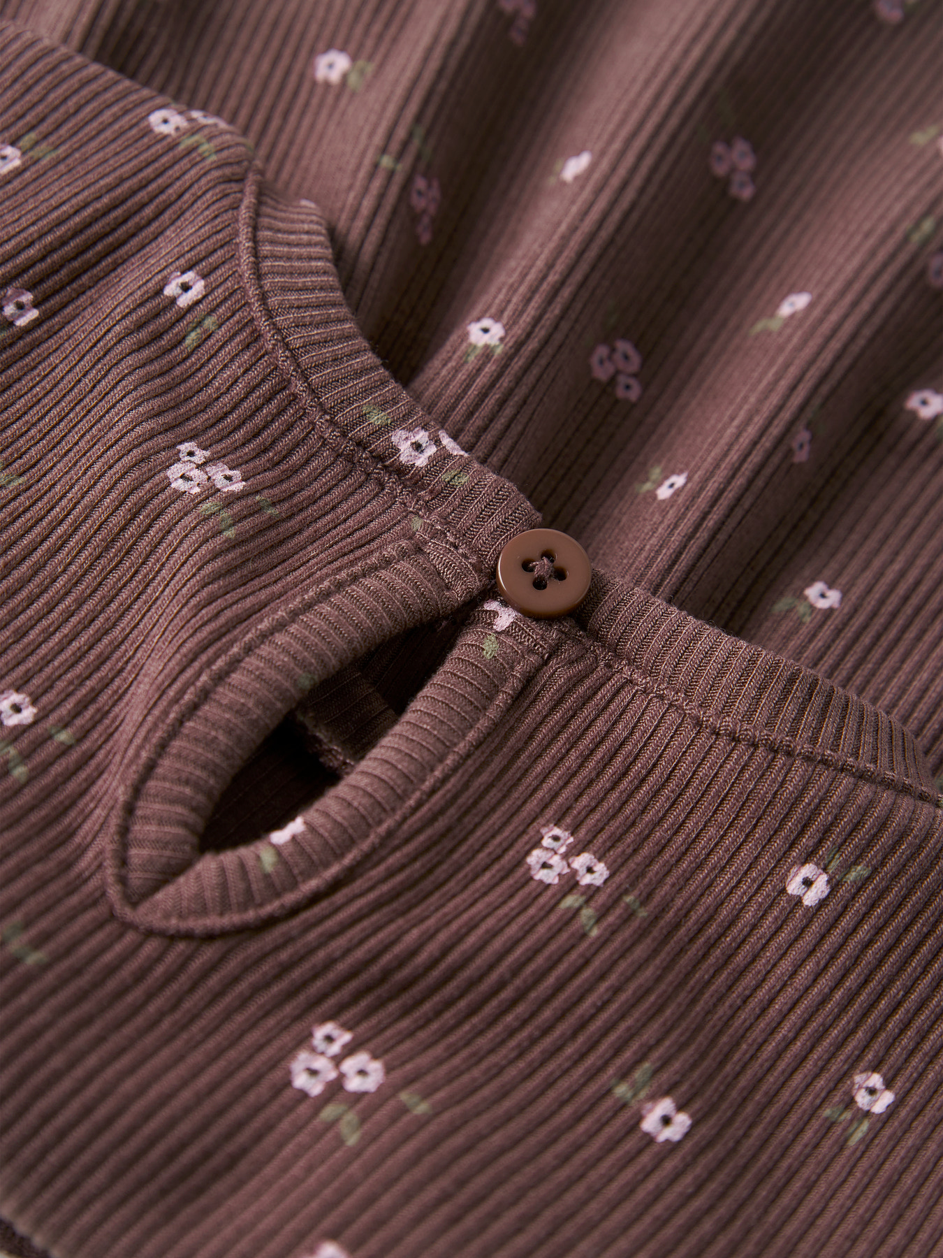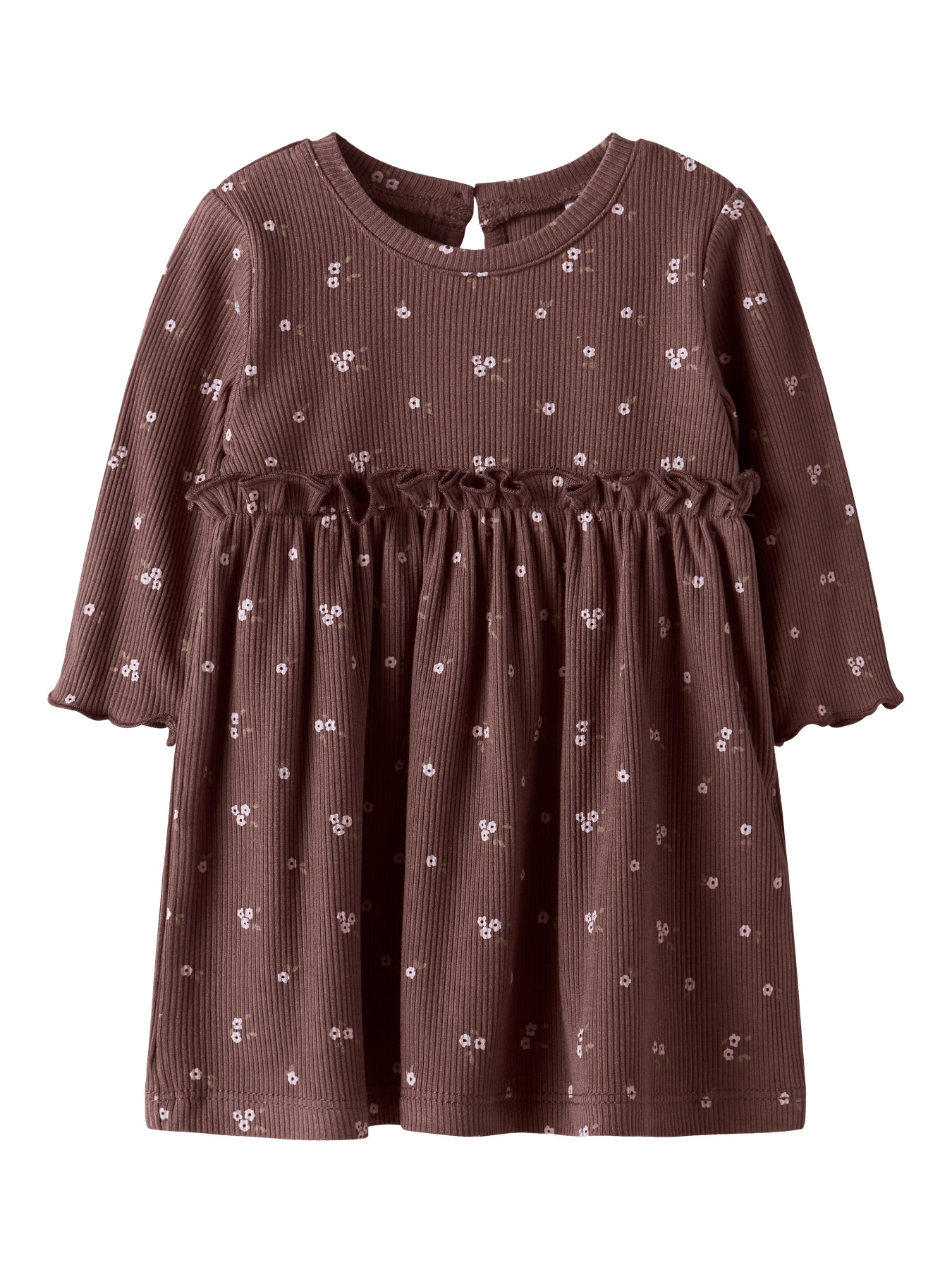 Mega sød baby kjole fra Name it. Den er i skøn brun farve med print af små blomster. Den er med super fin flæsekant hele vejen rundt og fin hul knap lukning i nakken. Den er i blød og lækker kvalitet.