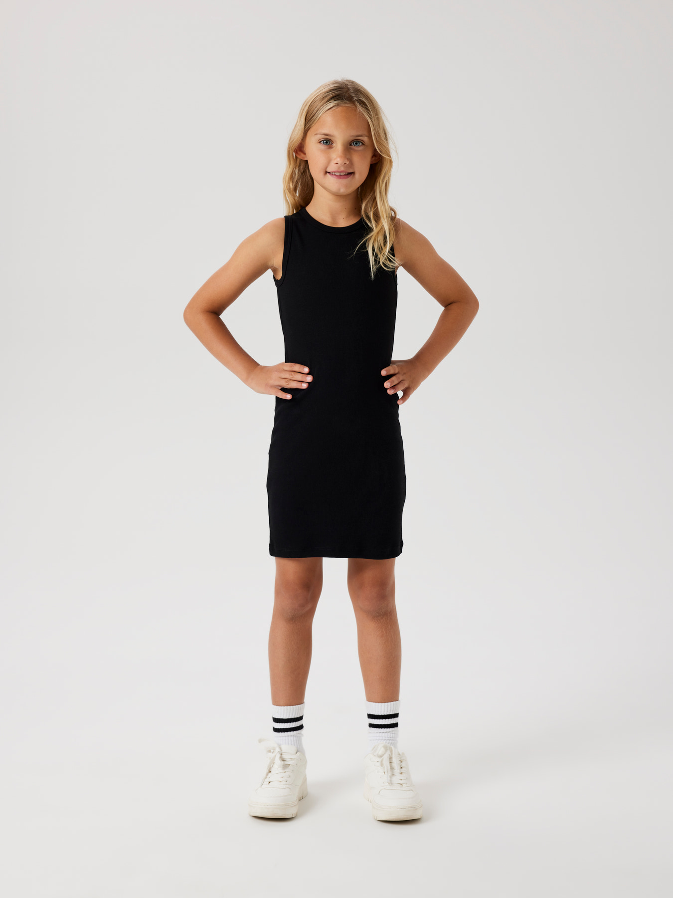 En virkelig lækker kjole fra Name It i blød rib. Kjolen har brede stropper, rund halsåbning og slutter lige over knæet.