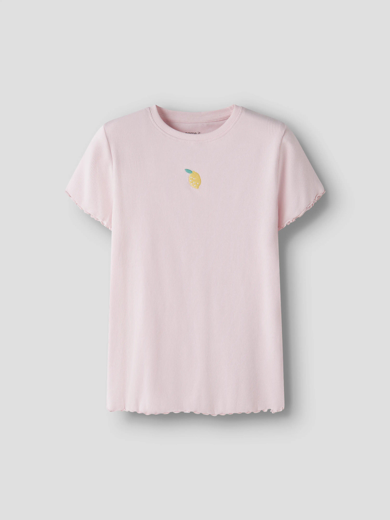 En sød basis t-shirt fra Name it i blød rib, korte ærmer og rund halsåbning. På brystet er der broderet en lille citron.