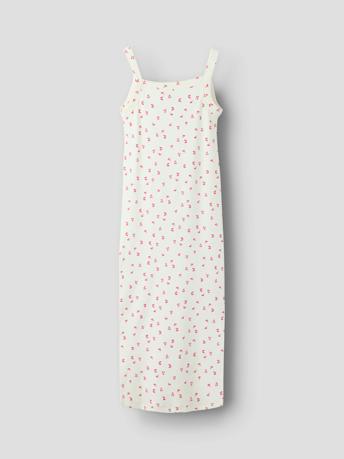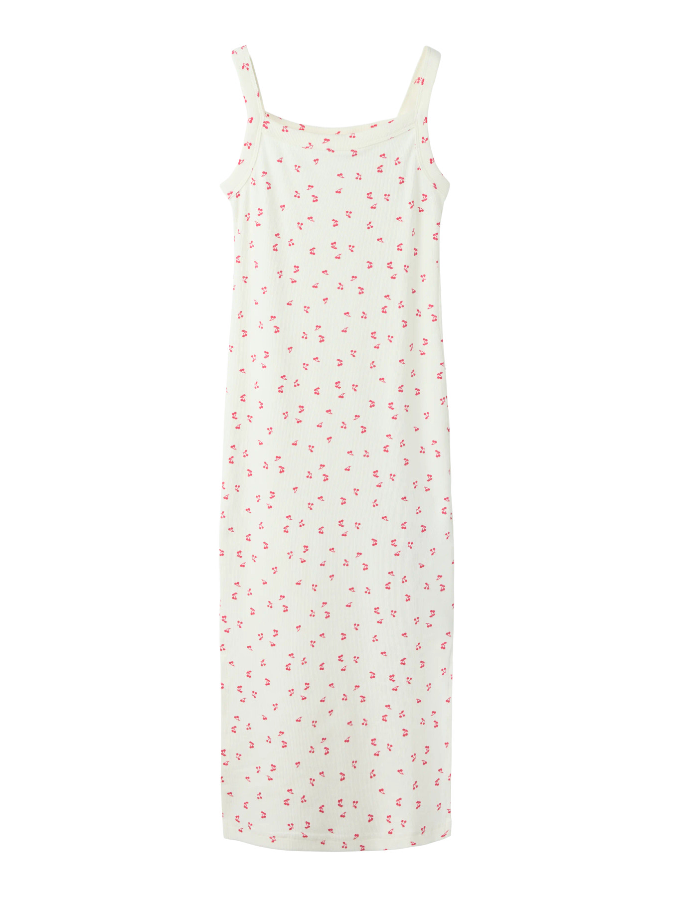En yndig og enkel kjole fra Name it med et fint kirsebærprint. Kjolen har stropper og slids forneden. Kjolen er i blød rib.