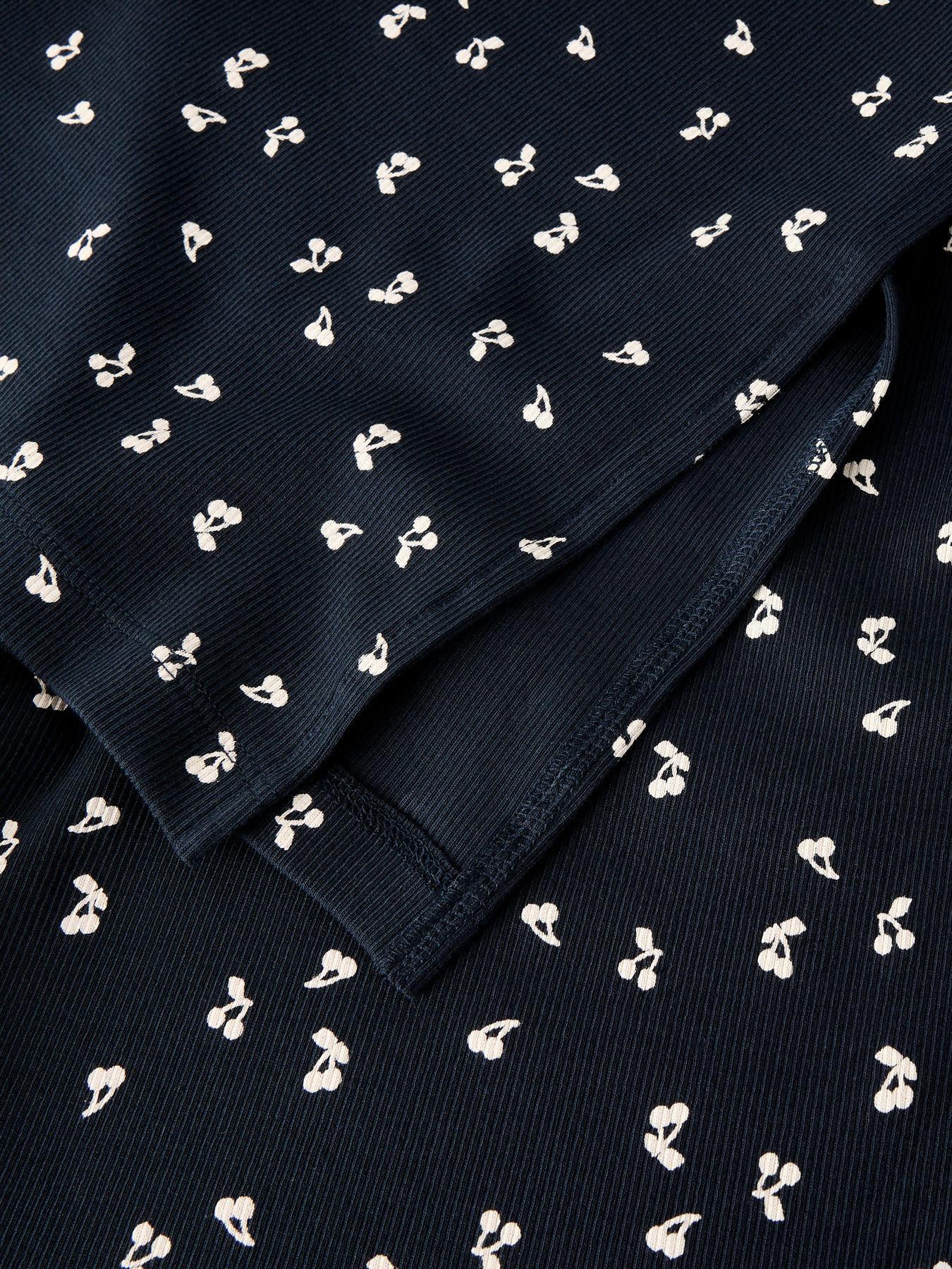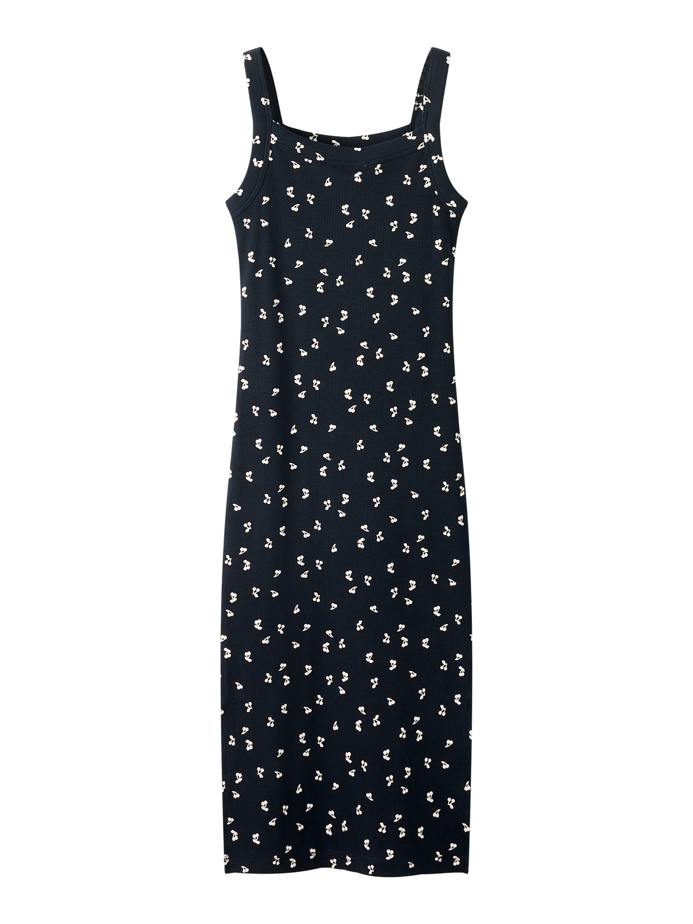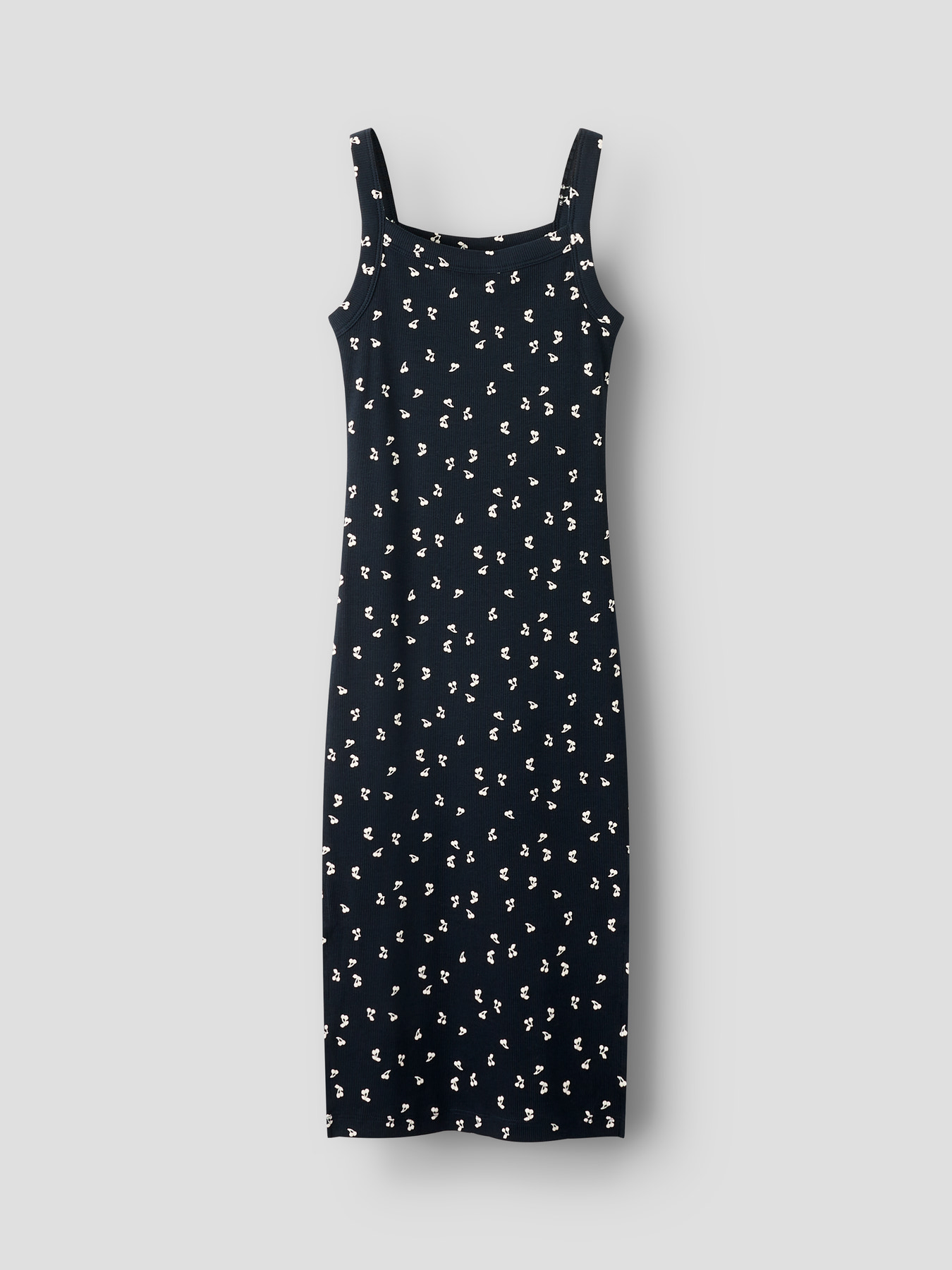 En yndig og enkel kjole fra Name it med et fint kirsebærprint. Kjolen har stropper og slids forneden. Kjolen er i blød rib.