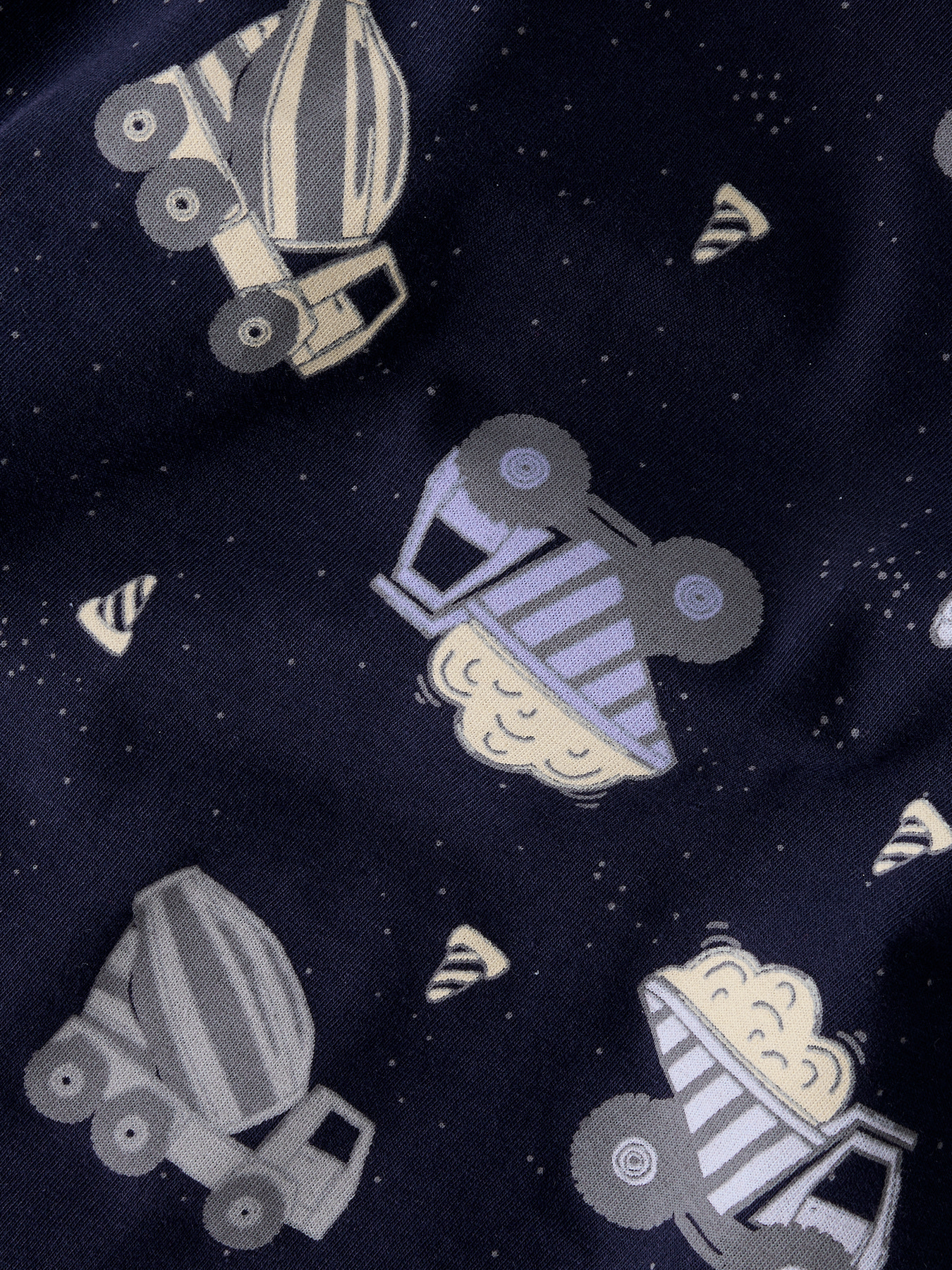 Mega sejt sæt fra Name it med shorts og matchende t-shirt. Shortsene er ensfarvede med en enkelt lastbil på venstre ben, og t-shirten er med et allover print af forskellige køretøjer.