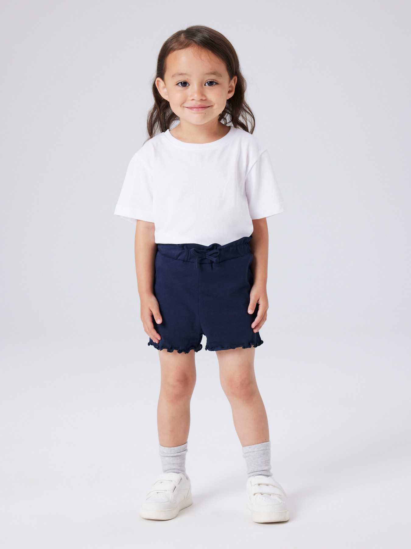 Bløde og stilfulde shorts til børn i elastisk ribstrik med vertikale striber. Med flæsekant på benene, fast bomulds-snøre og regular fit er de perfekte til sommerens leg og hverdagsoutfits.