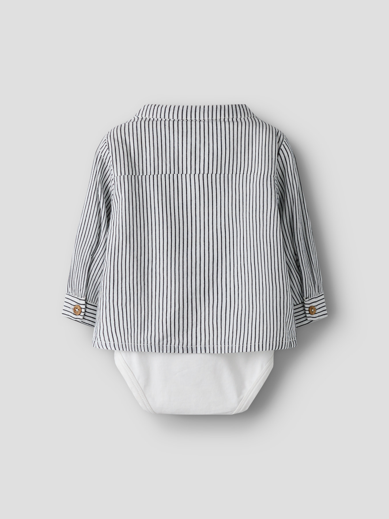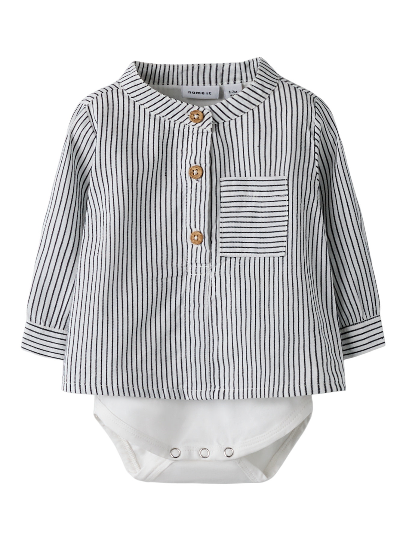 Elegant og praktisk skjortebody fra NAME IT BABY, lavet i blødt, vævet stof med et diskret krydsmønster. Med skjortekrave, lange ærmer, brystlomme og trykknapper i skridt samt knaplukning foran kombinerer den stil, komfort og nem påklædning til din lille.