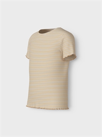Super fin t-shirt fra name it. Den er med korte ærmer og er rund i halsen. Den er lavet i den blødeste og lækreste kvalitet og så er den i det dejlige rib og med fine tynde striber. Ved kanten af ærmerne og i bunden af blusen er kanten lidt bølget.