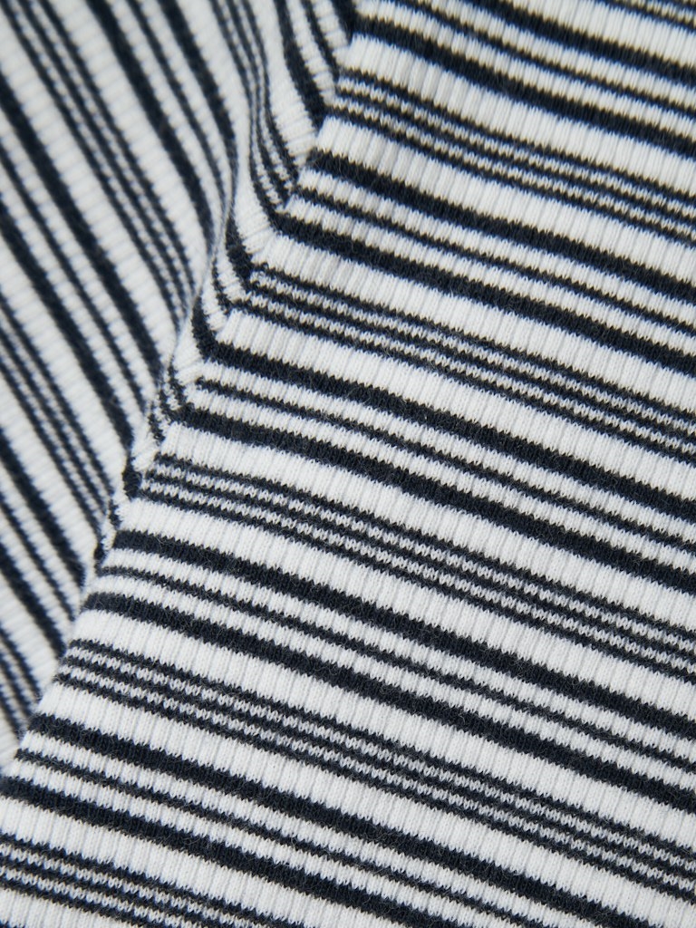Super fin t-shirt fra name it. Den er med korte ærmer og er rund i halsen. Den er lavet i den blødeste og lækreste kvalitet og så er den i det dejlige rib og med fine tynde striber. Ved kanten af ærmerne og i bunden af blusen er kanten lidt bølget.
