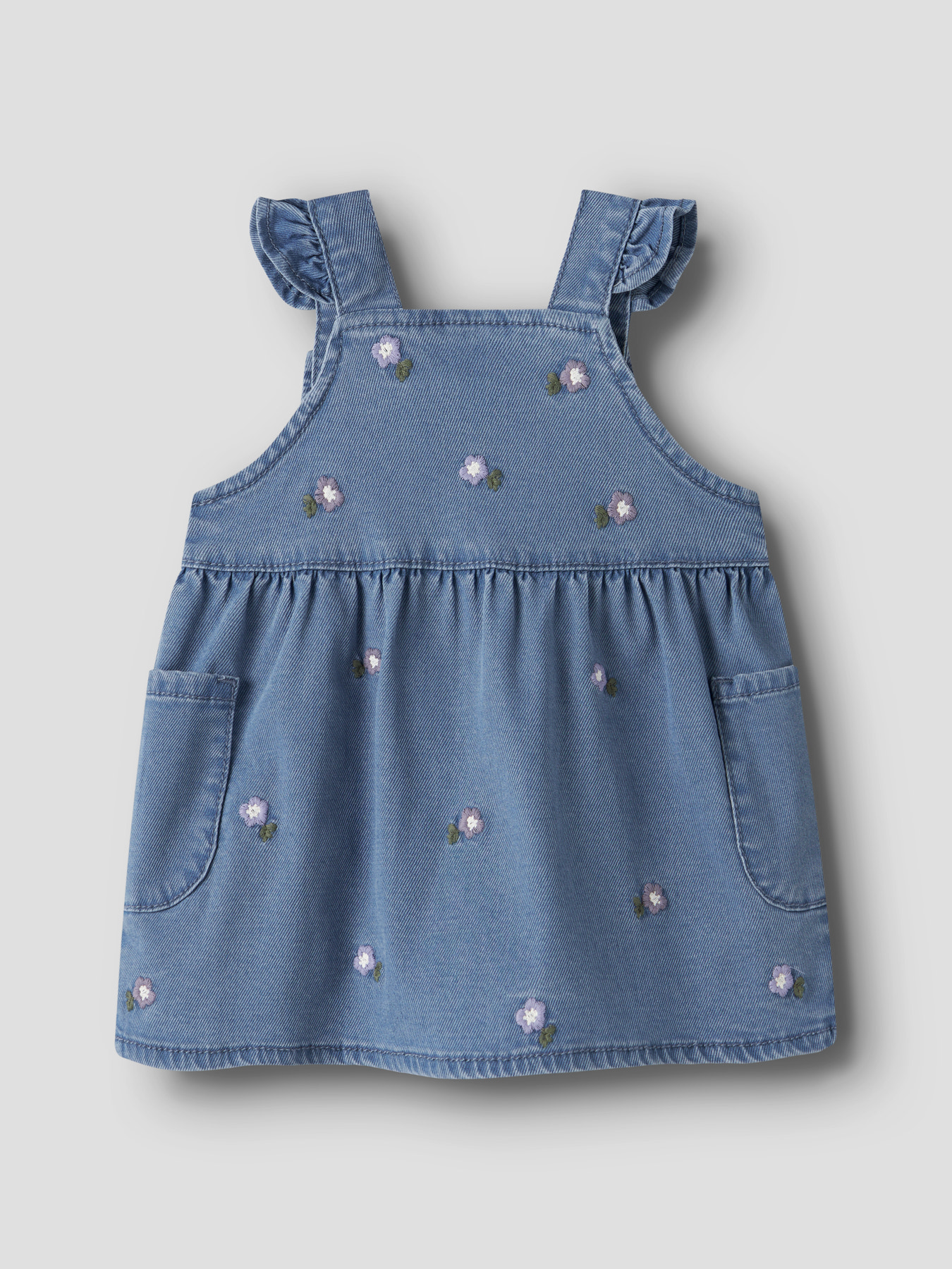 En virkelig fin og dejligt blød spencer fra Name it med blå, broderede blomster på. Kjolen har flæser på skuldrene og lukkes foran med trykknapper.