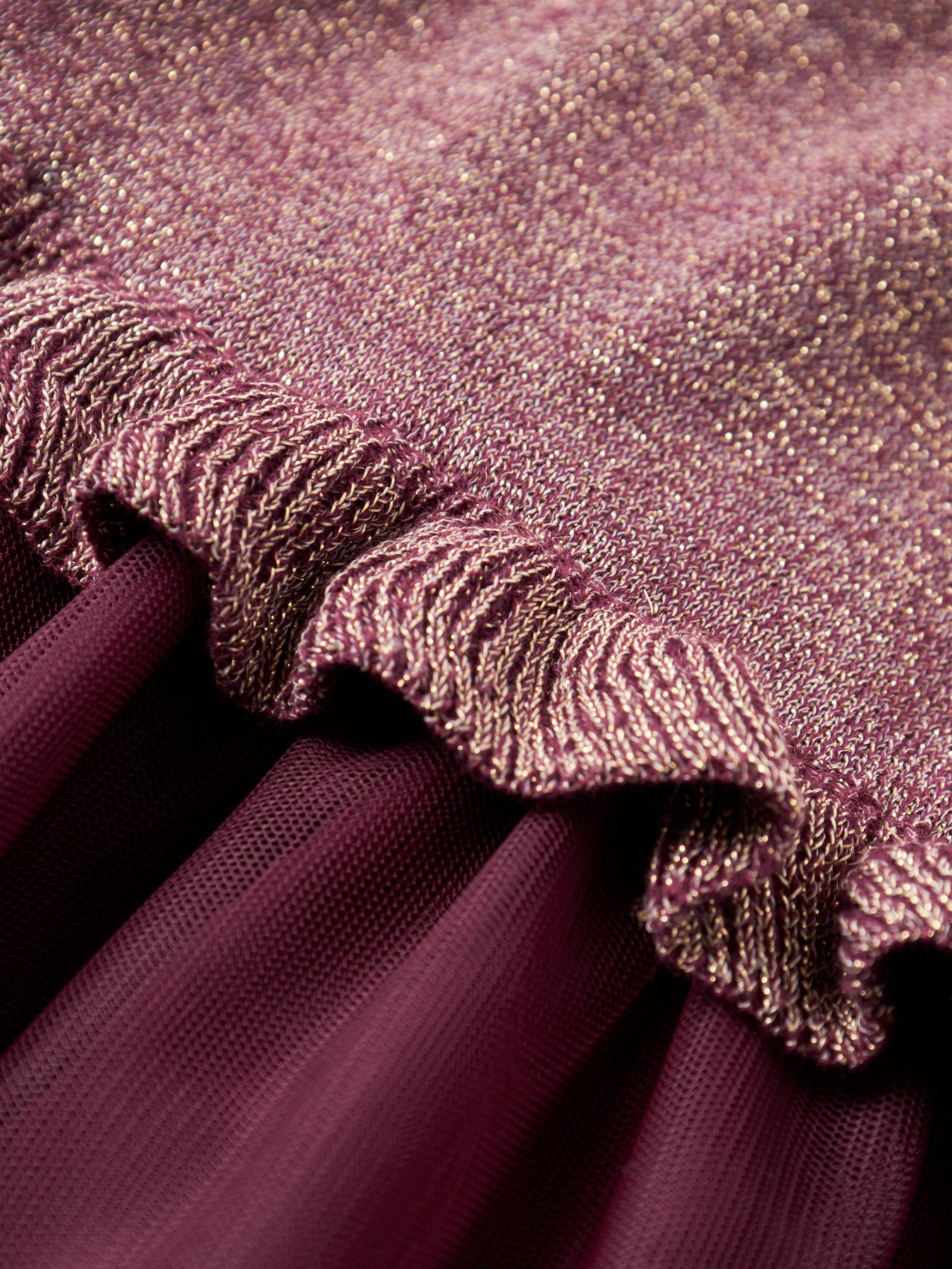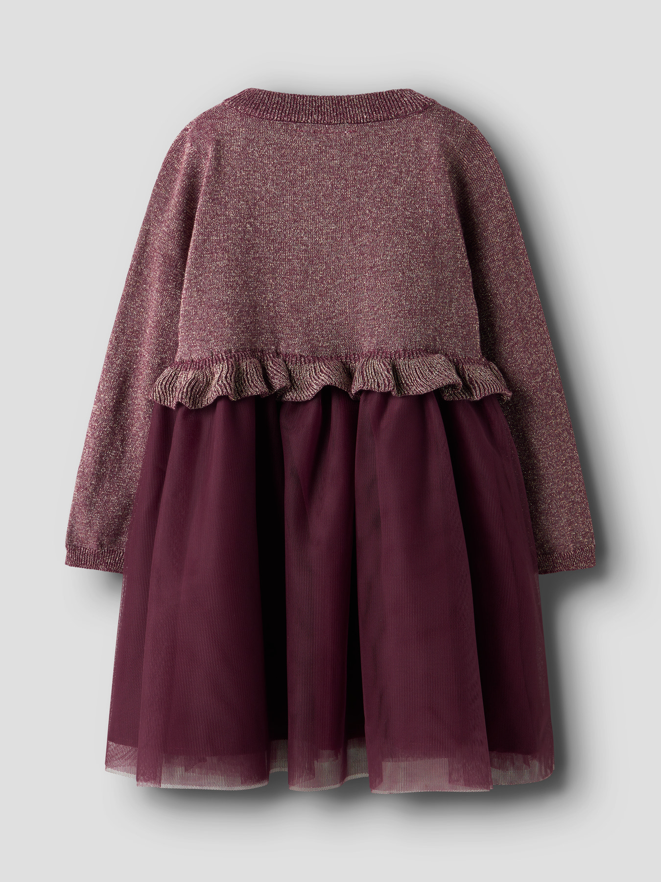 Smukkeste kjole fra Name it. Den er med strik del øverst, lange ærmer og sød flæsekant. Den er med glimmer tråd så den skinder flot. Den er med tyl del nederst i den flotteste farve.