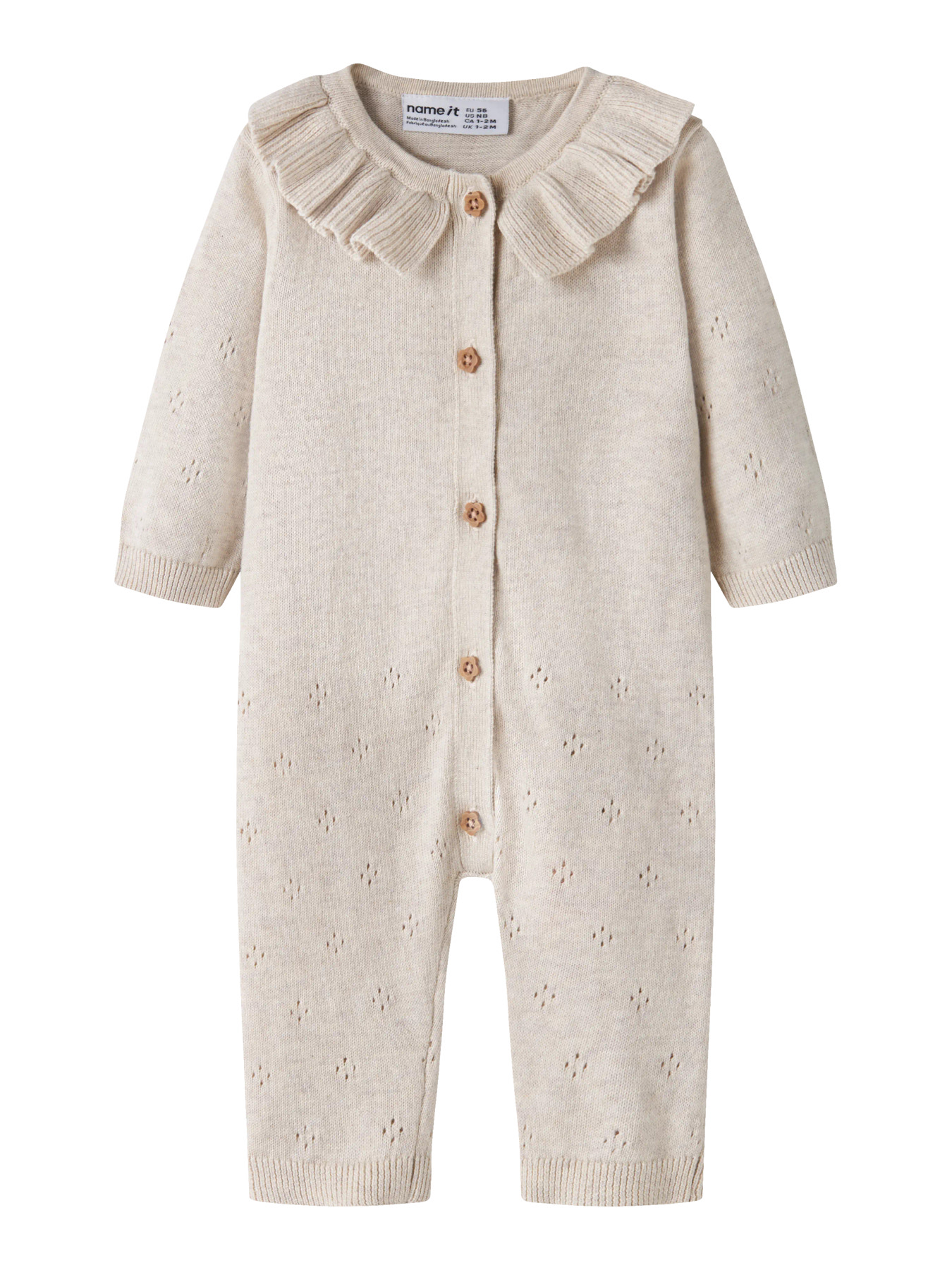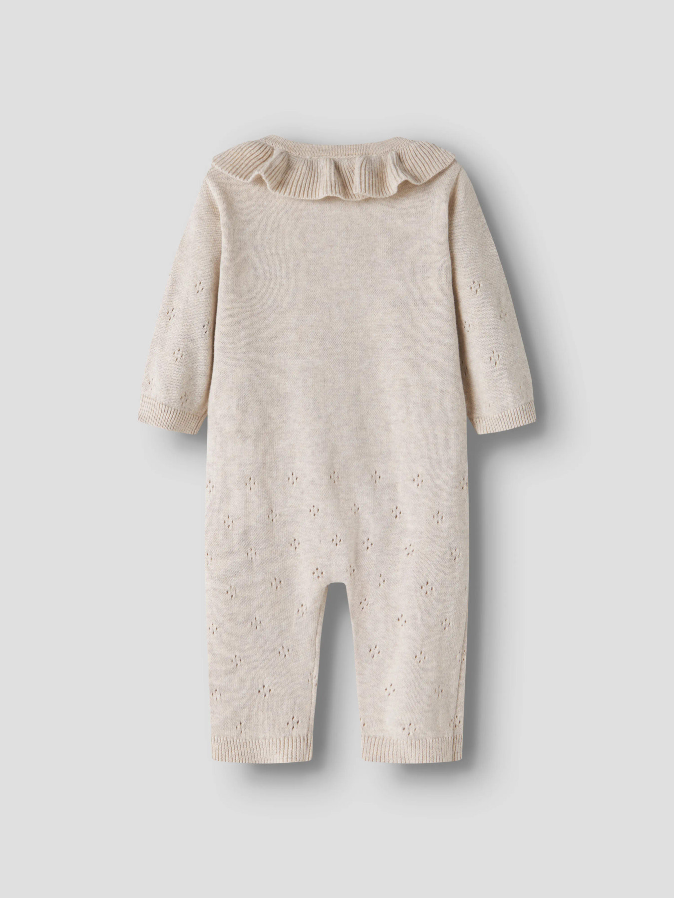 Skab et komfortabelt og stilfuldt look til dit barn med den smukkeste jumpsuit i blød strik. Den har knaplukning og ribkanter ved ærmerne for en god pasform, og det åbne mønster giver et sødt og moderne udtryk. Perfekt til både hverdag og særlige lejligheder.