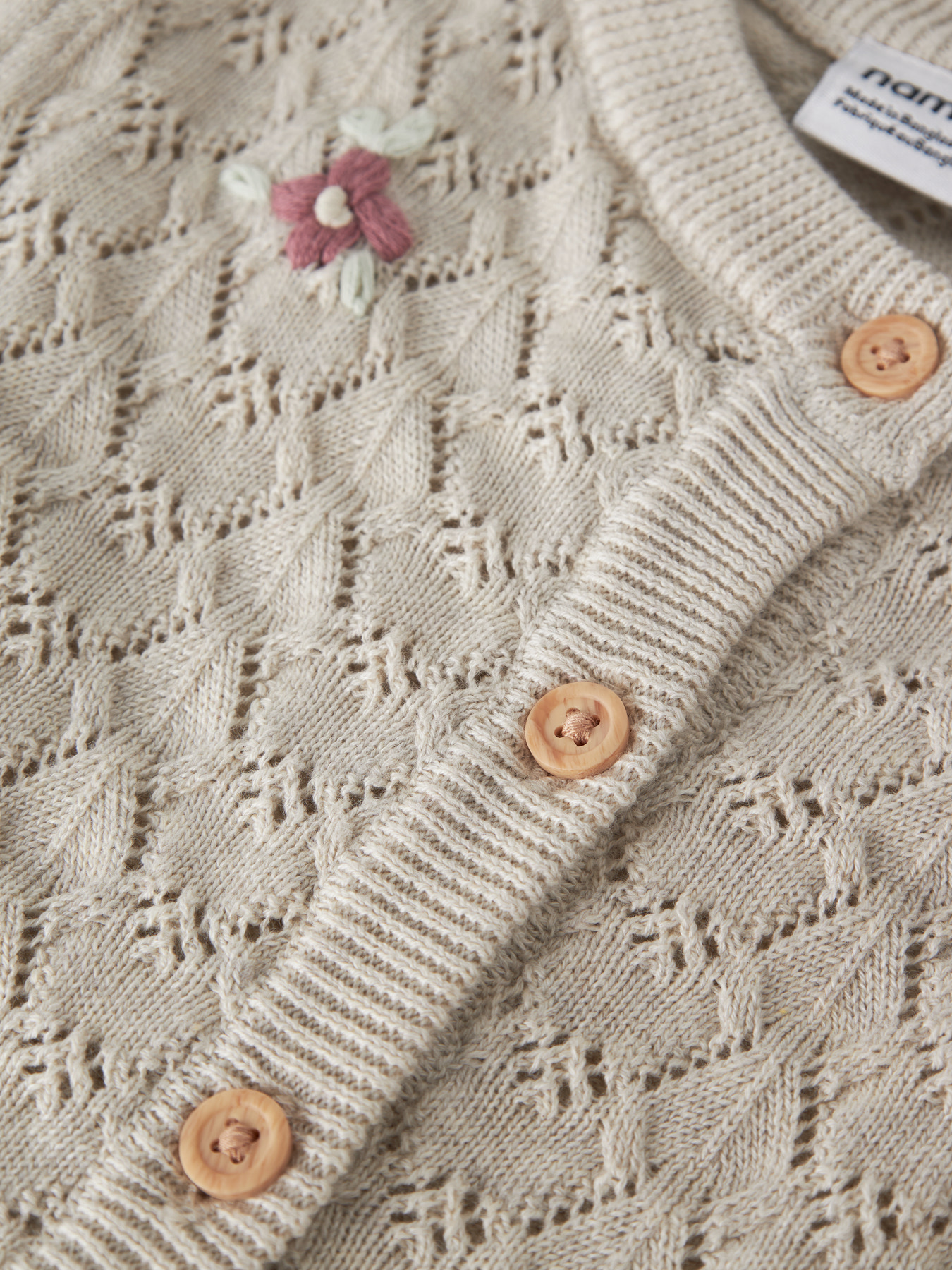 Skab et let og stilfuldt sommerlook med en luftig og yndig cardigan fra Name It. Den har rund hals, lange ærmer, knaplukning, broderi og fine detaljer i ærmer og bunden af trøjen, der giver et elegant udtryk.