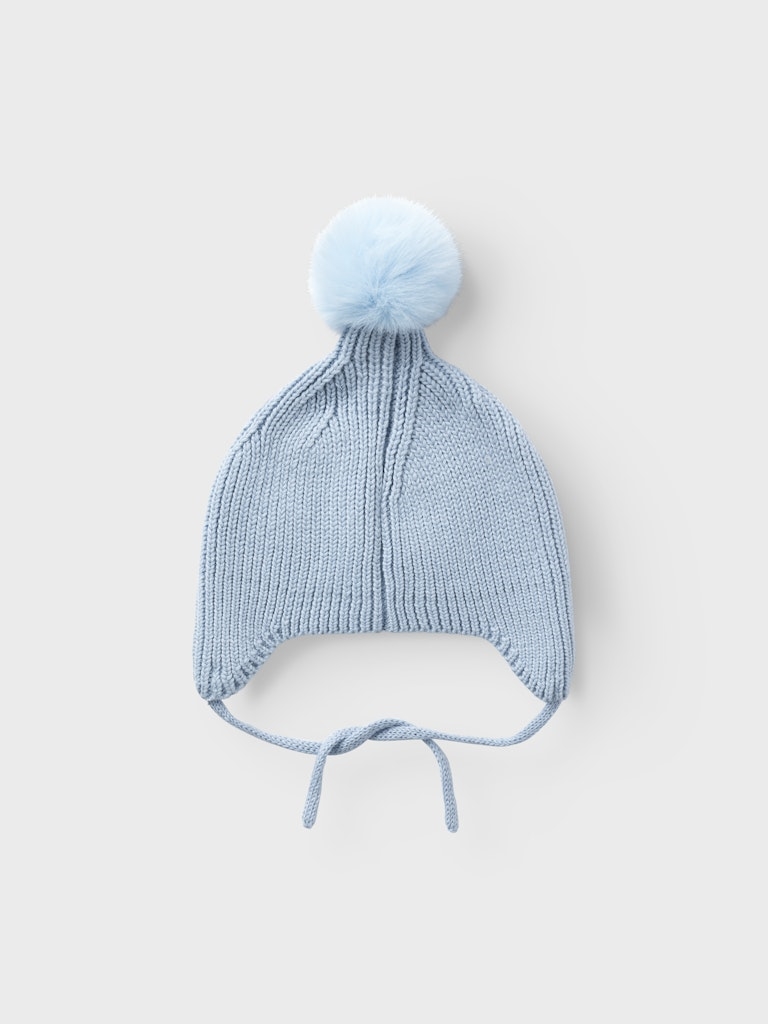 Mega sød strikket hue fra Name it. Den er i den fineste blå farve, er blød og lækker og med en sød kvast på toppen. Huen har et ekstra stykke der går ned og dækker ørerne, og så kan den bindes ved halsen så den ikke kan tages af.