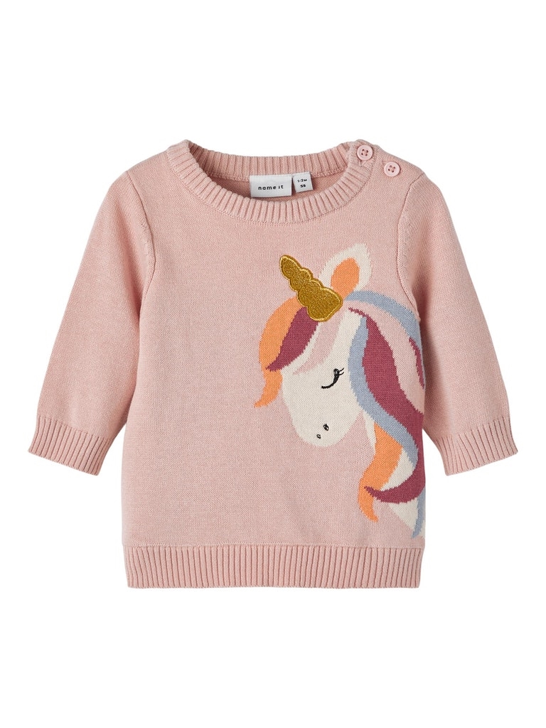 Skøn striktrøje fra Name It med en sød enhjørning på maven. Rund hals, lange ærmer og rib i alle kanter. Knapper ved venstre skulder.
