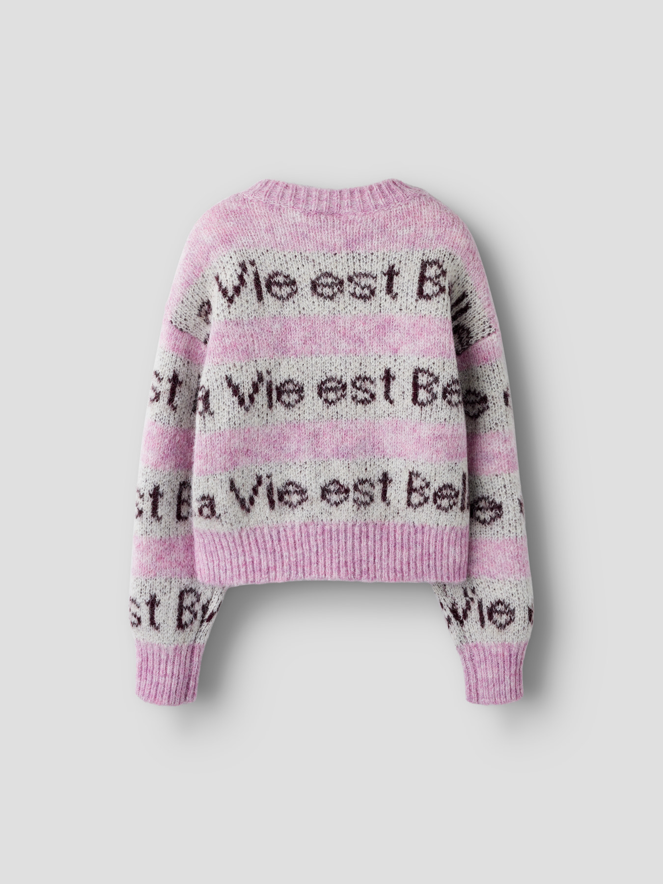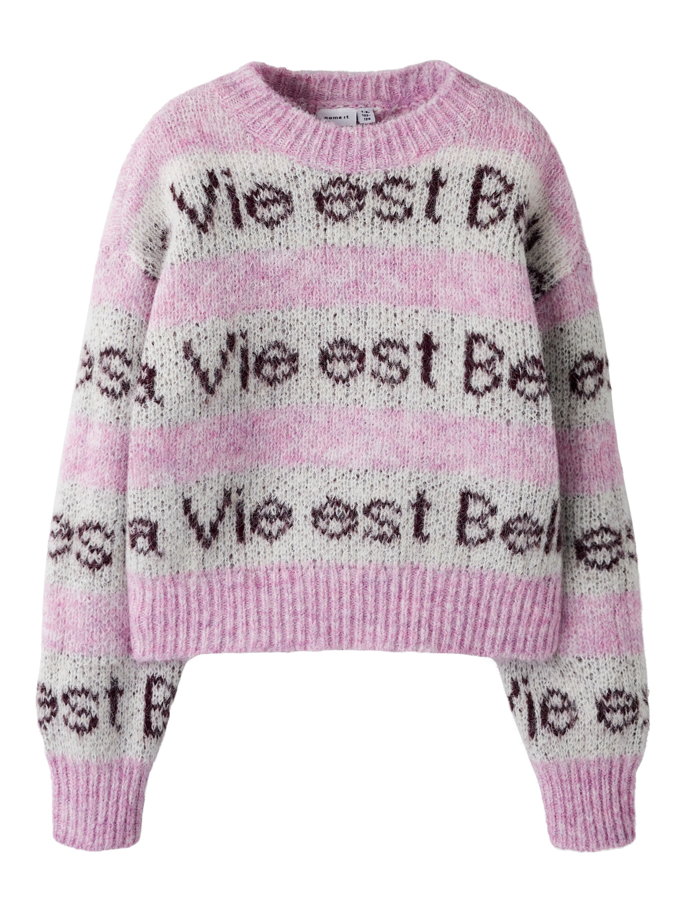 Den smukkeste striktrøje fra name it. Den er i en sød farve med tekst på.