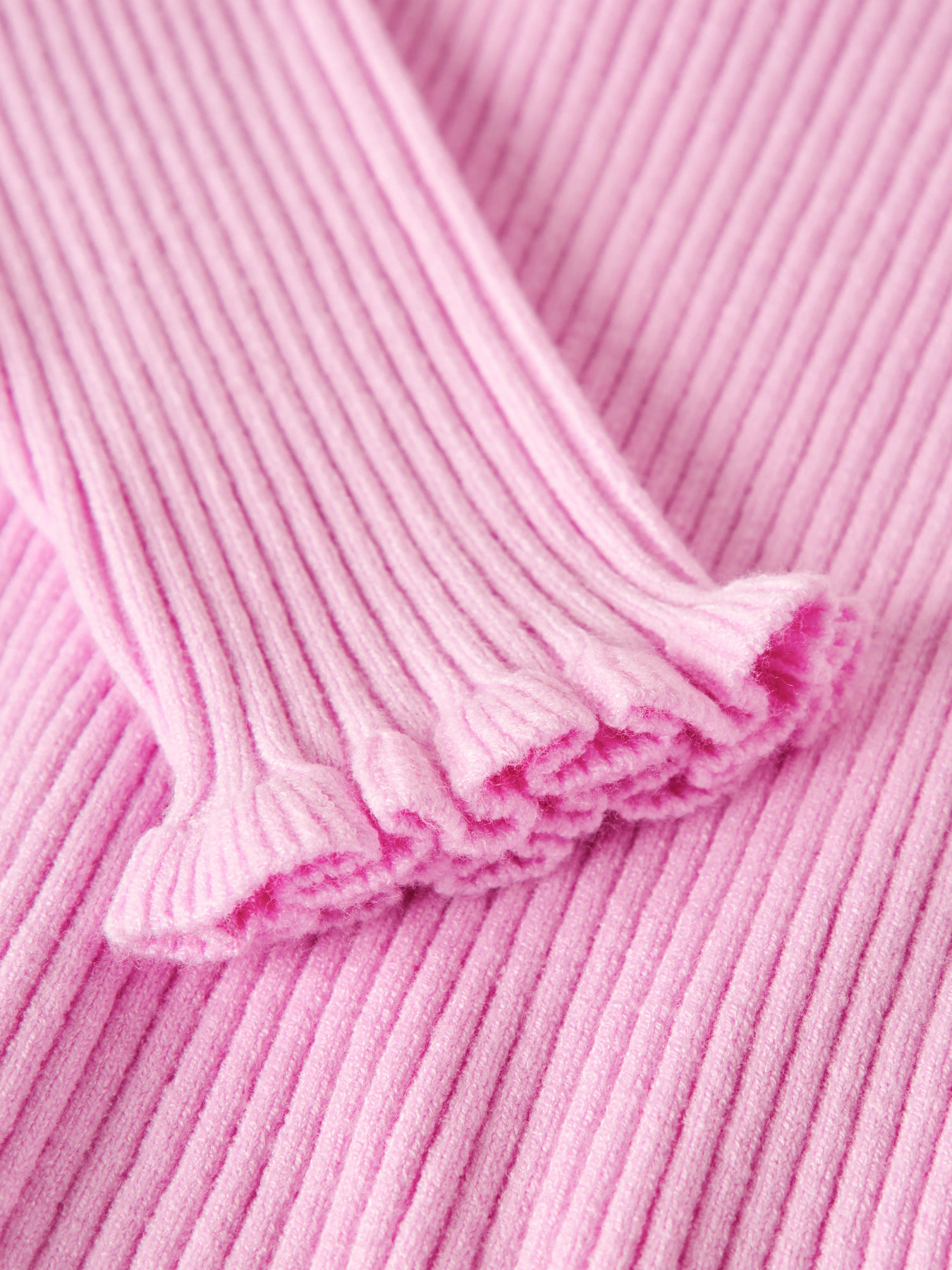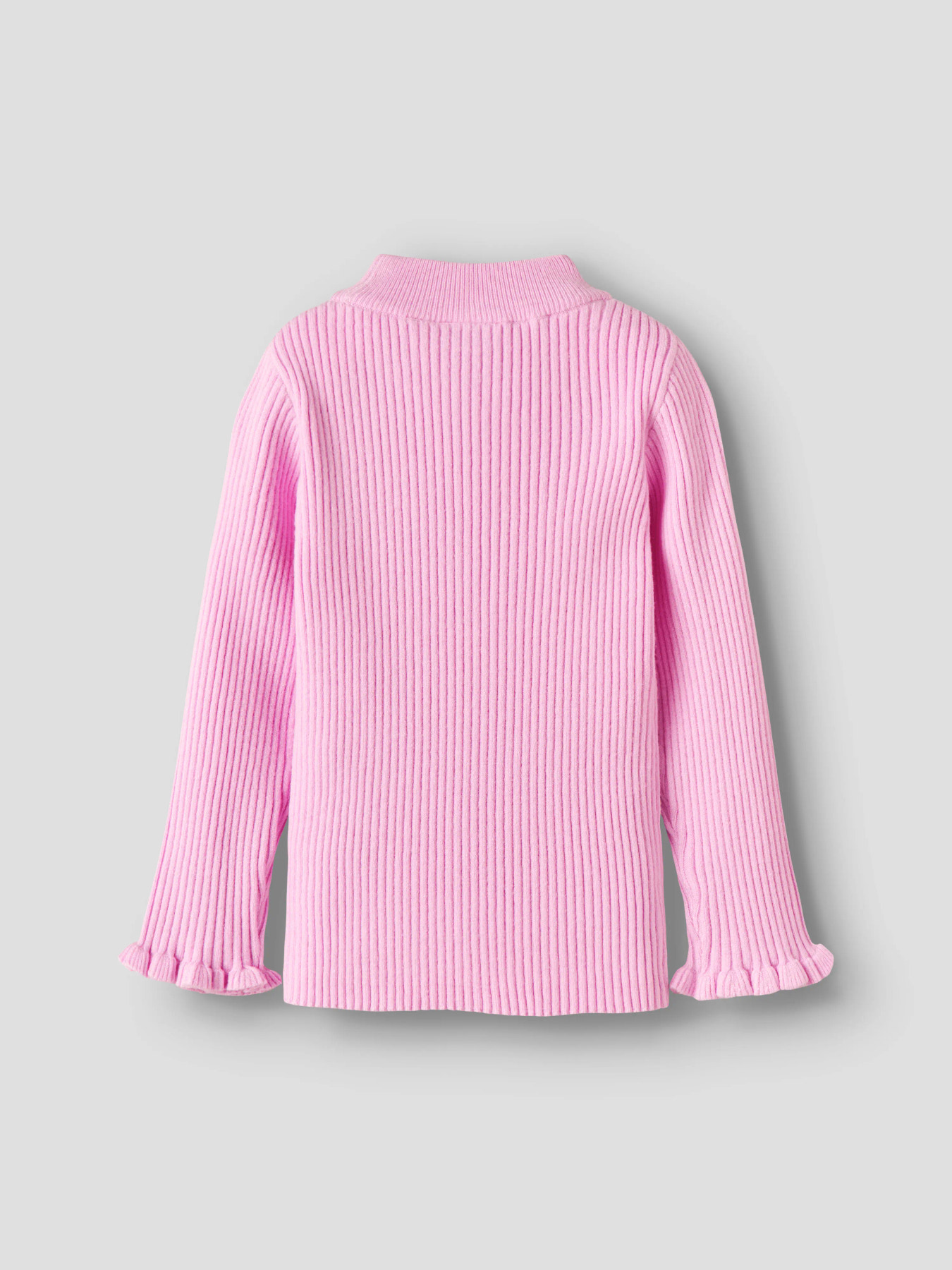 Strikkede pullover i ribstrik med god elasticitet og et tidløst udtryk. Den har rund hals, lange ærmer med fine flæsekantede manchetter, som giver et sødt og stilfuldt look i en tætsiddende slim fit.