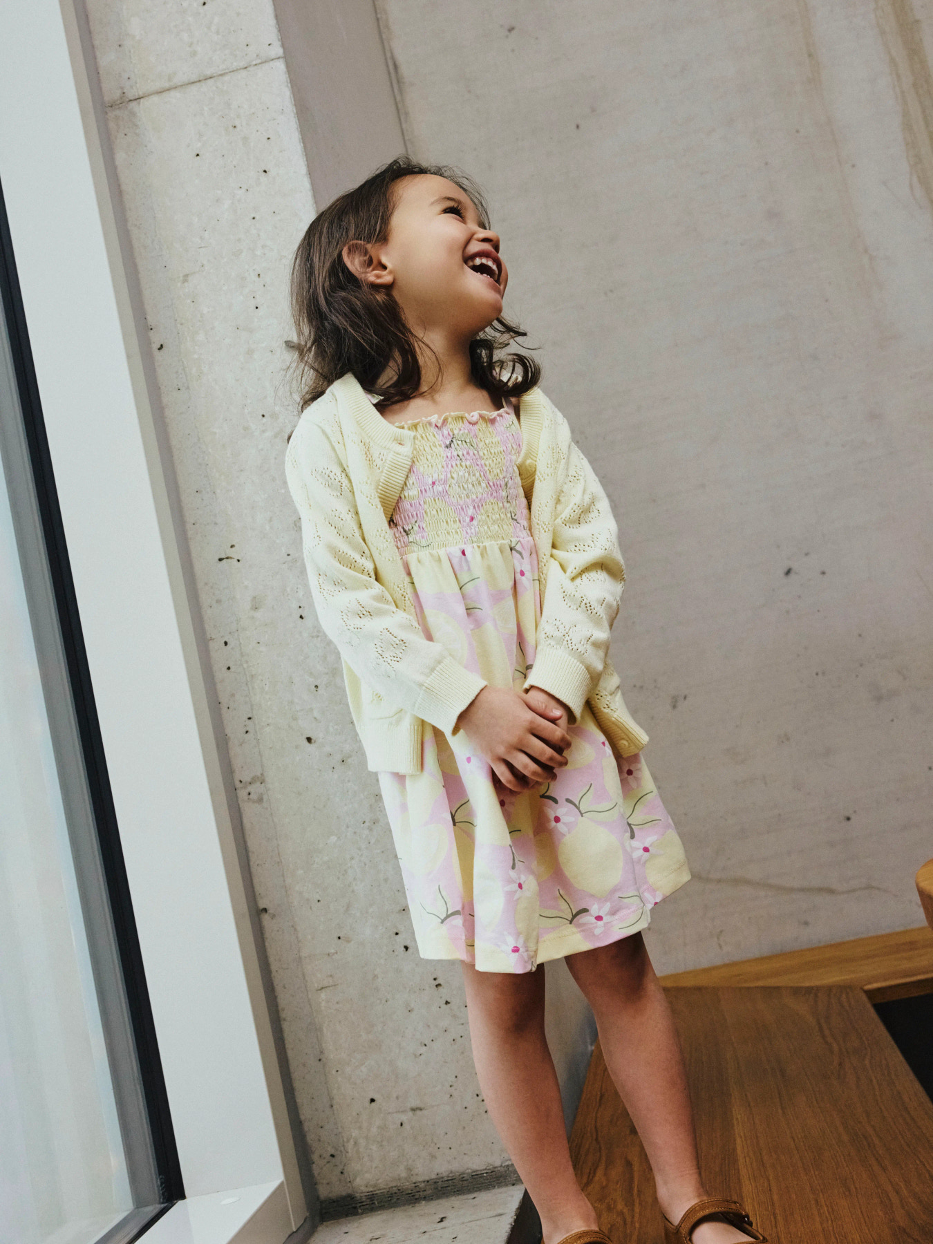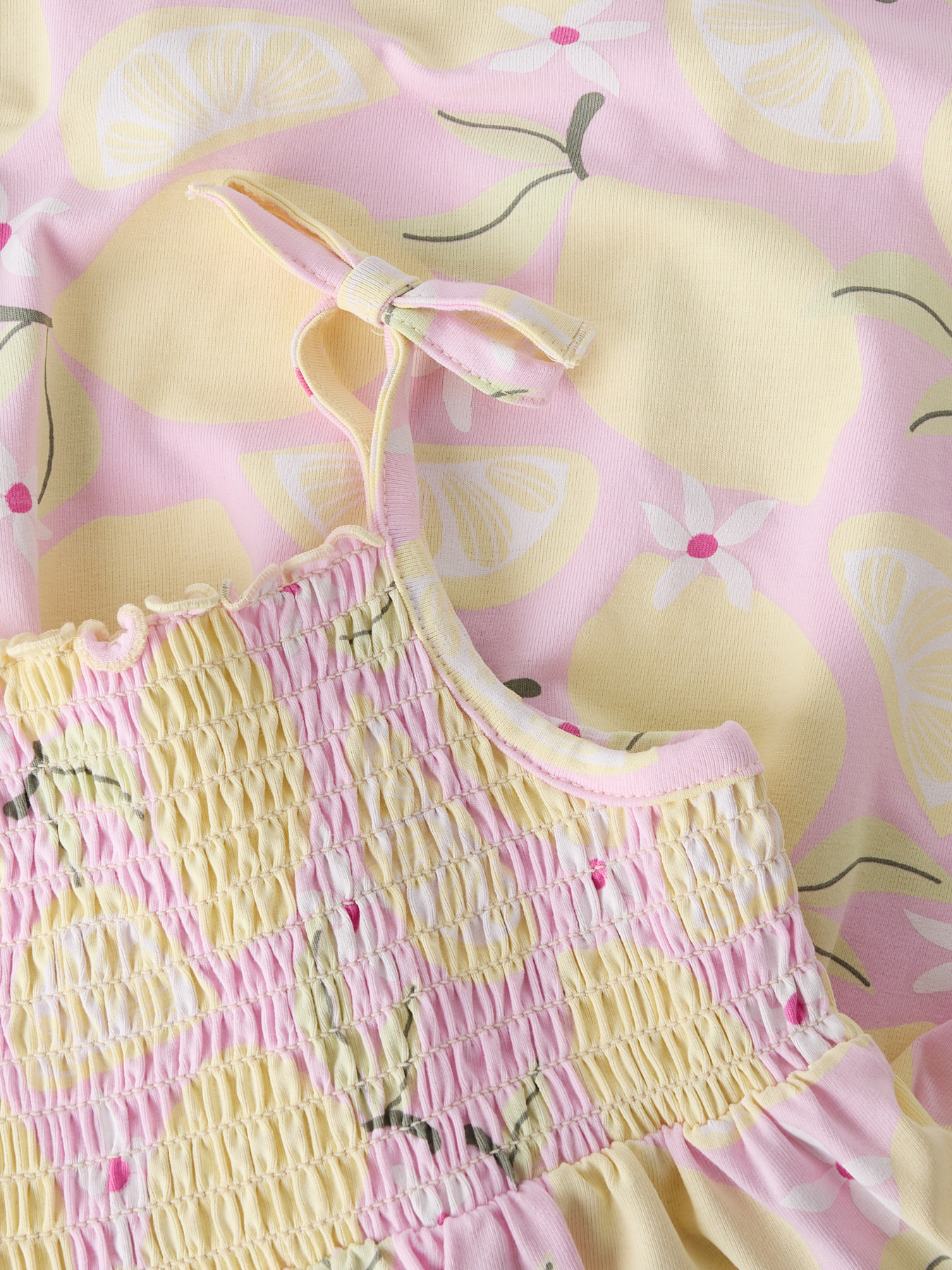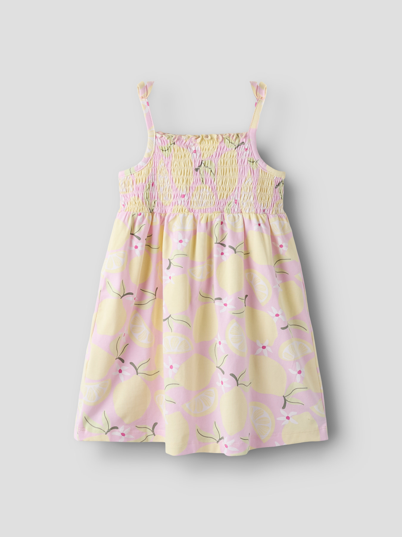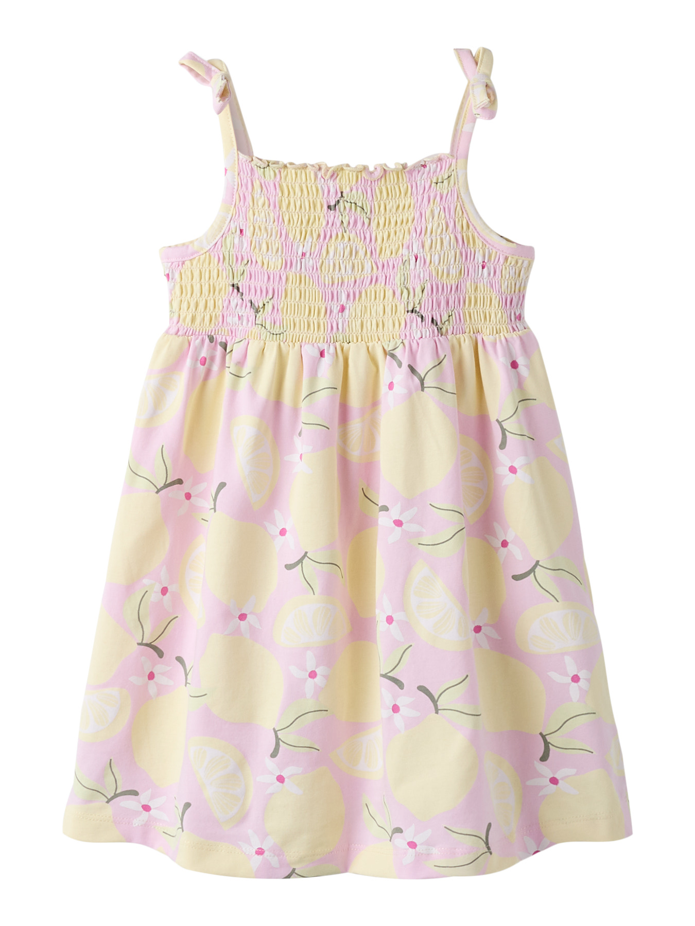 Sød og komfortabel smock-kjole til børn i blødt, strækbart jersey-stof. Med firkantet hals, ærmeløs og print over hele stoffet – perfekt til enhver lejlighed.