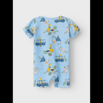 Den fineste sunsuit fra name it. Den er med korte ærmer og ben, den er rund i halsen og så er lavet i den blødeste og lækreste kvalitet. Sunsuiten er lavet med et fint print over det hele og så har den en knapper på brystet så den er nemmere at få over hovedet og så har den flere trykknapper ved bleen.