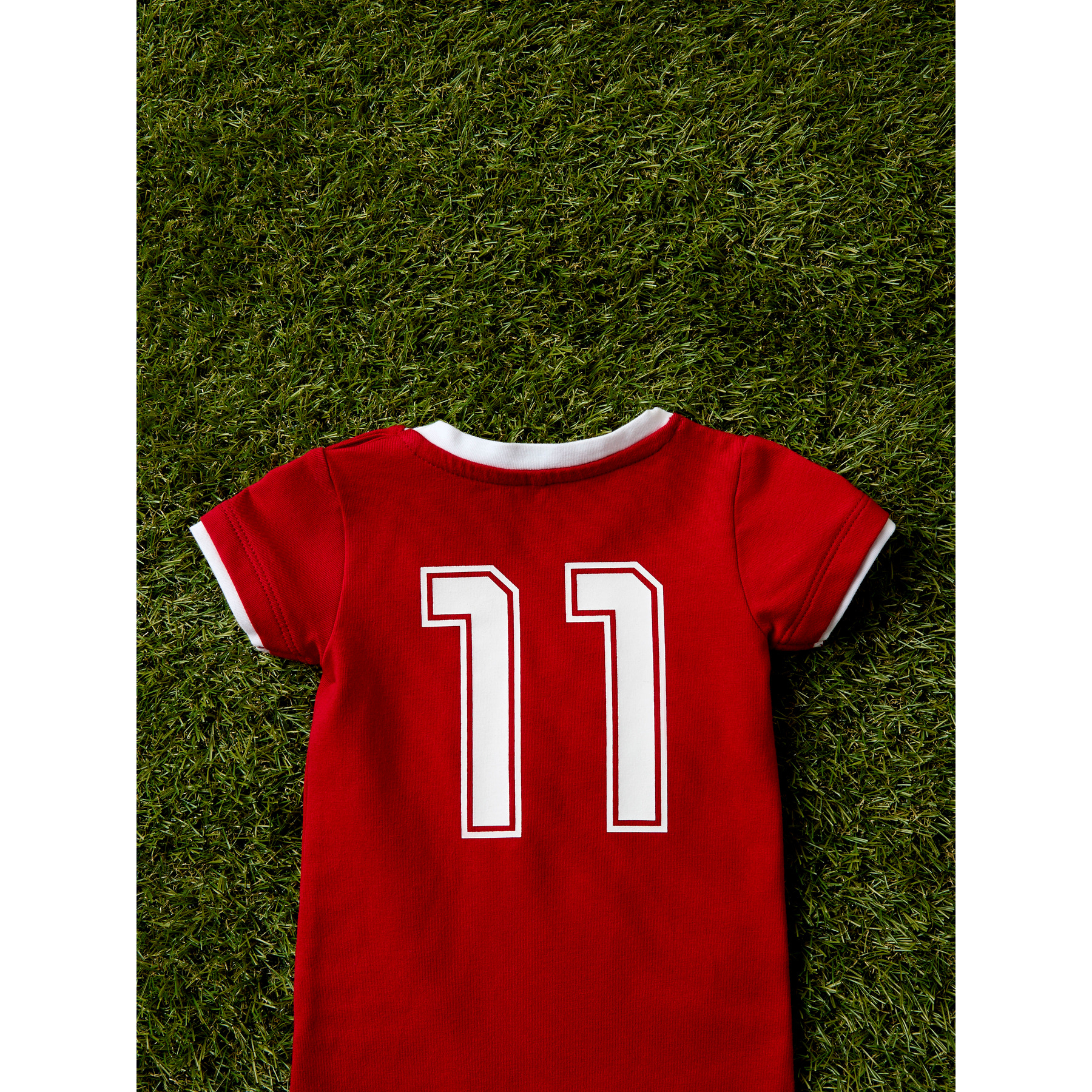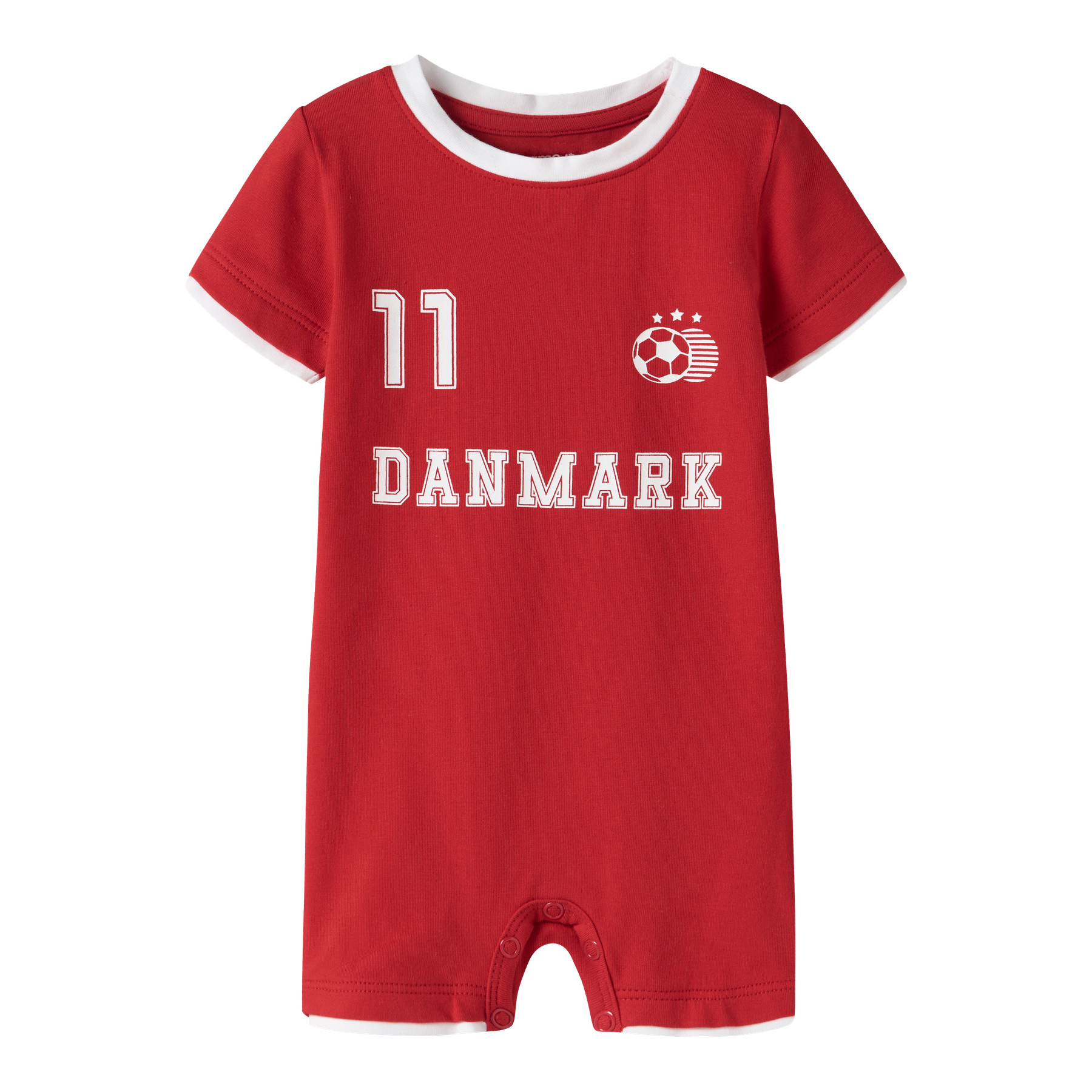 Denne røde jumpsuit har hvide ribkanter ved hals og ærmer, og er prydet med et '11 DANMARK' print på fronten samt et stort '11' på ryggen. Den er fremstillet i blødt og strækbart jerseystof, som giver en behagelig følelse og god bevægelsesfrihed. Praktiske trykknapper i skulderen og i skridtet gør den nem at tage af og på.