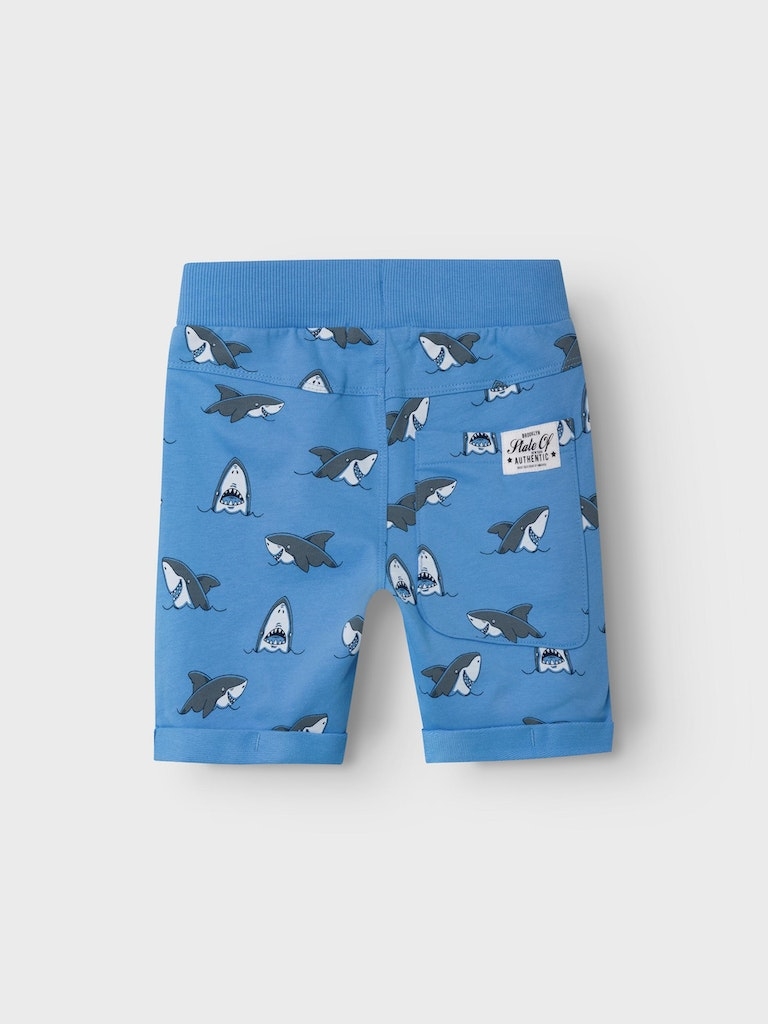 Fede sweat shorts fra Name It lavet i dejligt blødt bomuld. Sejt all-over print, snøre i livet, funktionelle lommer både i siderne og bagpå og opsmøg ved benene.