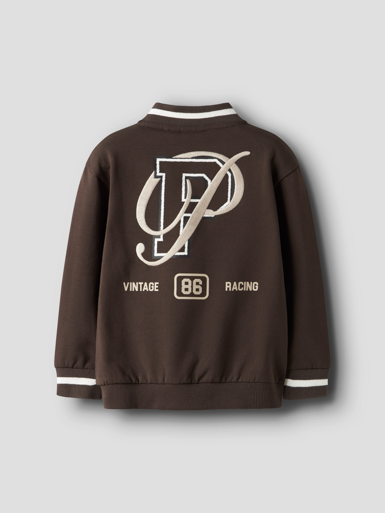 Den sejeste cardigan i blød sweat fra Name it med mange fede detaljer. Cardiganen lukkes med lynlås, stribet ribkant ved hænderne og i bunden af cardiganen, så den får et bomberjacket look. På ryggen er der et tryk, og der er ligeledes sejt tryk på brystet og ærmerne.