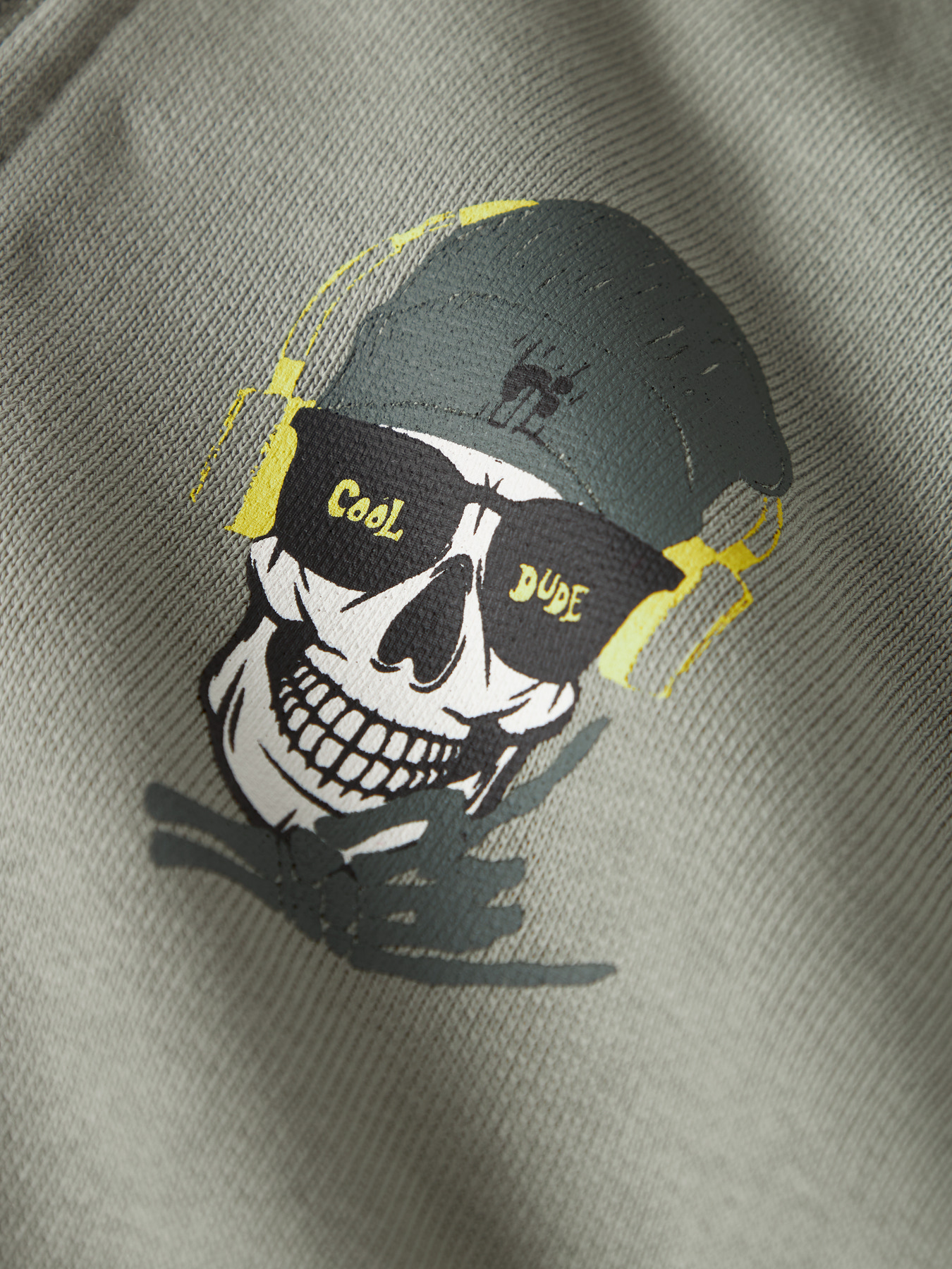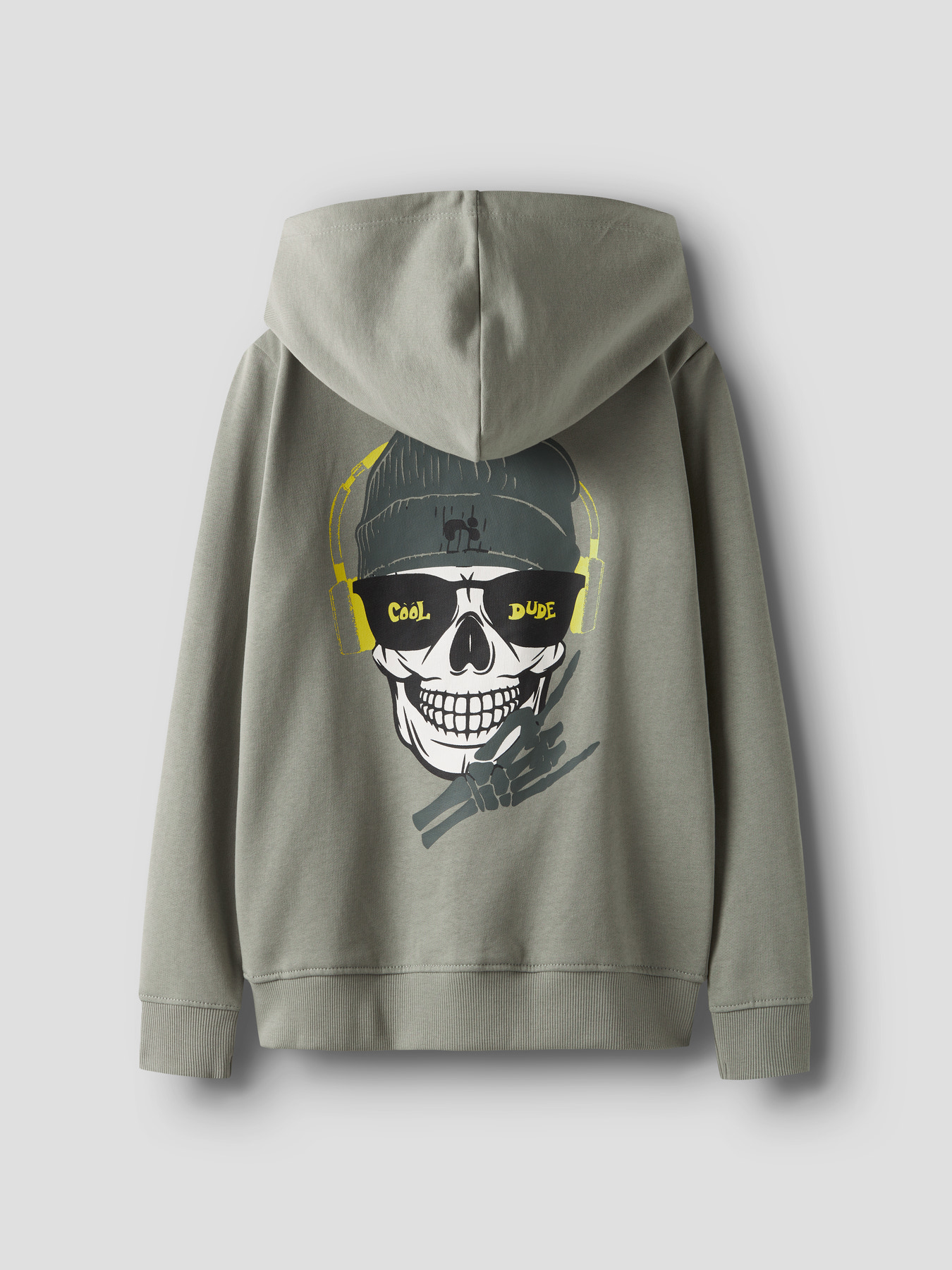 Den sejeste sweat cardigan fra name it. Den er grøn med et sejt dødningehoved på foran og bagpå.
