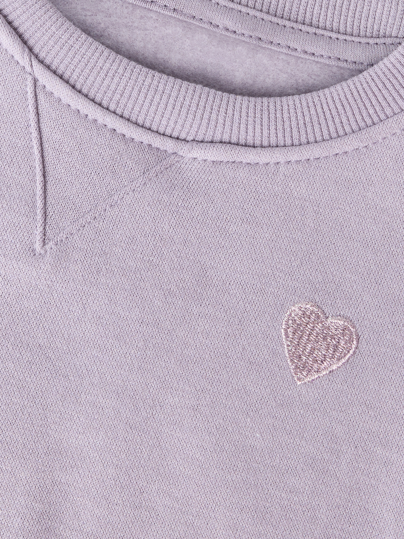En virkelig fin sweatshirt fra Name it med et lille broderet hjerte på det ene bryst. Blusen er med pufærme, rund hals og rib ved hænderne. Blusen er ekstra blød indvendigt og uden tvivl lækker at have på.