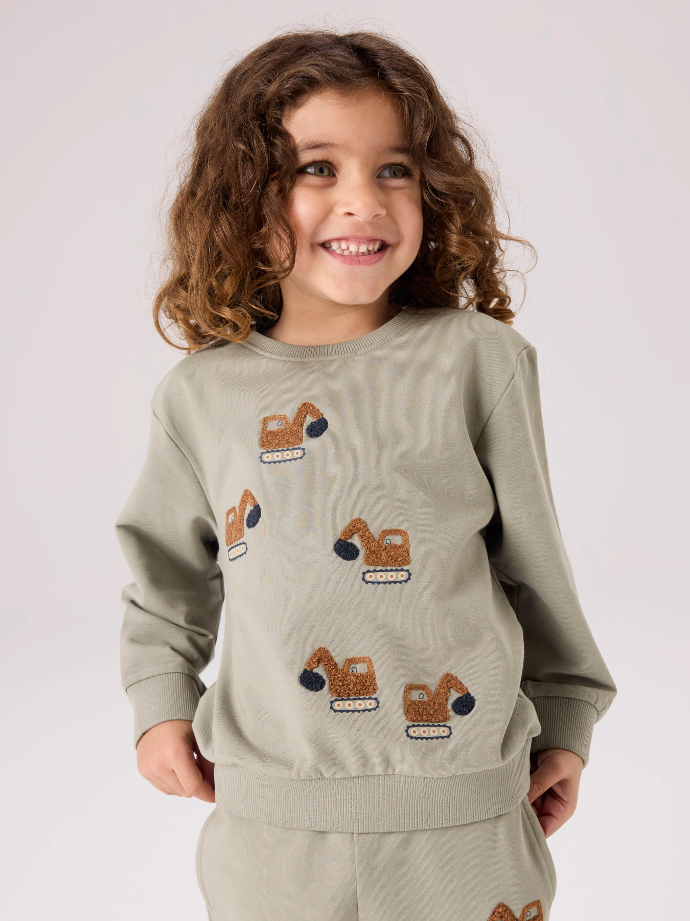 Super sej sweatshirt fra Name it. Den er i lækker grønlig farve med små maskiner i teddy. Den er i lækker blød kvalitet.
