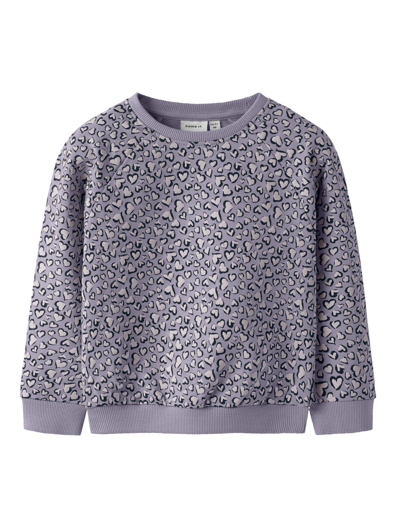 En virkelig fin sweatshirt fra Name it med et yndigt hjerteprint over det hele. Sweatshirten er dejligt blød og har ribkanter.