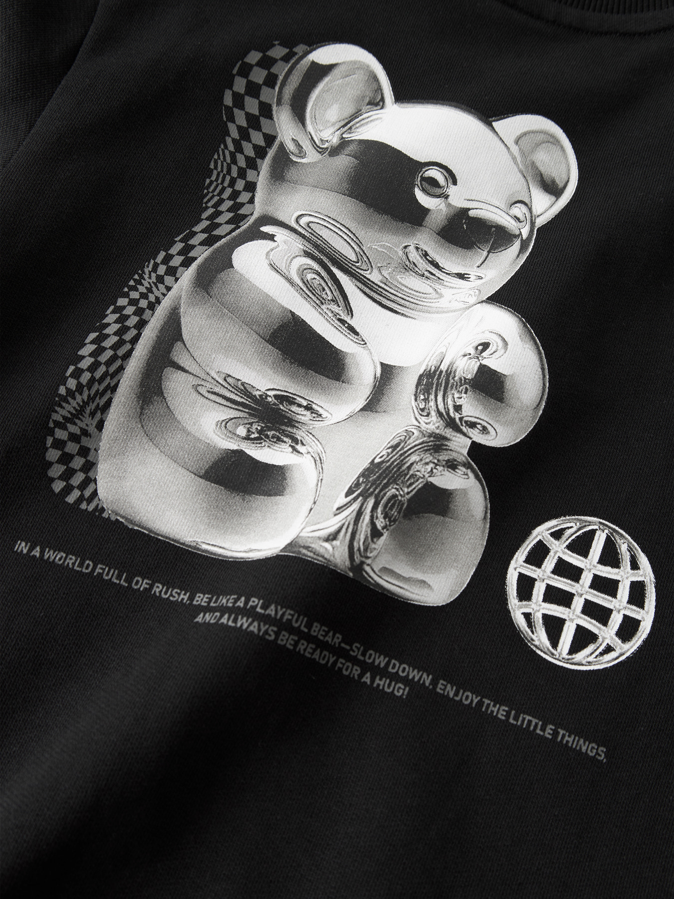 Den fedeste sweatshirt fra name it. Den er sort med et sejt tryk på ryggen og skrift foran.