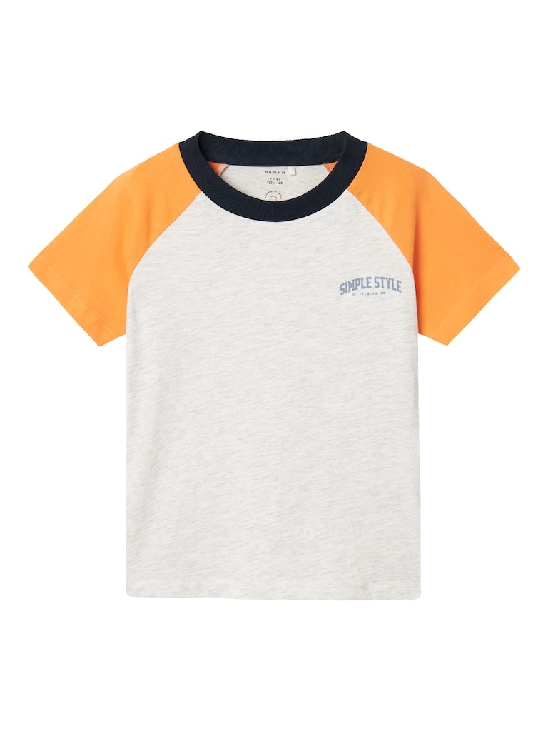 Sej t-shirt fra Name it med korte ærmer. T-shirten er i lys grå farve med orange ærmer og tekst print i toppen.