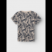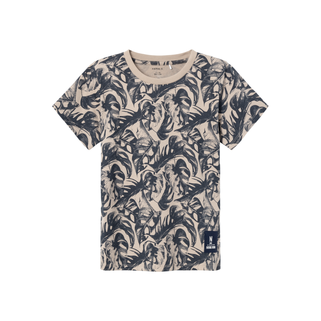 Super fin t-shirt fra name it. Den er med korte ærmer, er rund i halsen og er lavet i en blød og lækker kvalitet. Den har et sejt all over print med blade.