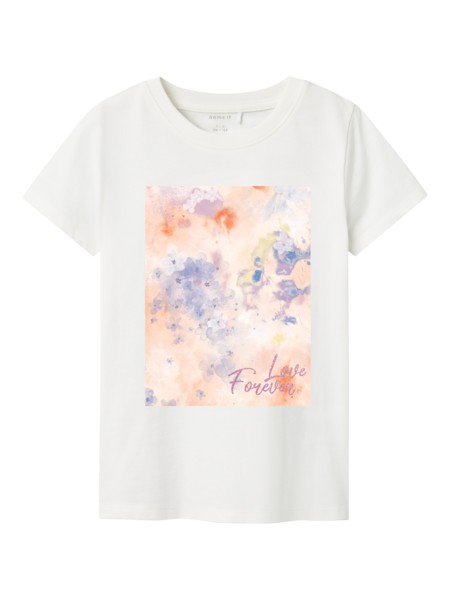 Super sød t-shirt fra Name it. Den er med korte ærmer, er rund i halsen og er lavet i en blød og lækker kvalitet. Blusen er i en klassisk hvid farve og med et mega flot print på maven i fine farver.