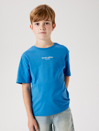 Super fed t-shirt fra name it. Den er med korte ærmer, er rund i halsen og er lavet i en blød og lækker kvalitet. Blusen er i en flot blå farve og har et lille tekst print på brystet.