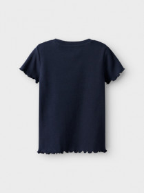 Super fin t-shirt fra name it. Den er med korte ærmer og er rund i halsen. Den er lavet i den blødeste og lækreste kvalitet og så er den i det dejlige rib. Ved kanten af ærmerne og i bunden af blusen er kanten lidt bølget.