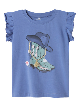 Super sød t-shirt fra Name it. Den er med små flæse ærmer og sejt print på maven med 3-D effekt med snørrer der hænger ud fra støvlerne. Den er i blød og lækker kvalitet.